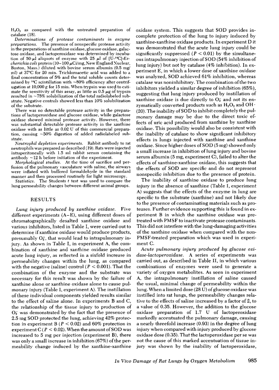 The intrapulmonary instillation into rat lung of enzymes that generate oxygen metabolites results in acute lung injury. The injection of xanthine oxidase and xanthine produces acute lung injury that, in the presence of superoxide dismutase, but not in the presence of catalase, can be significantly diminished, suggesting that O2- has the capacity to injure the lung. Instillation of a generator of H2O2, namely glucose oxidase, will, in sufficient quantities, produce acute injury that is not neutrophil-dependent. When either a low dose of glucose oxidase alone or lactoperoxidase alone is employed, little lung injury occurs. However, instilling the combination of the two enzymes produces severe, acute injury that can be blocked in a dose-dependent manner by catalase, but not by superoxide dismutase. Purified human leukocytic myeloperoxidase, but not horseradish peroxidase, will substitute for lactoperoxidase in the model of lung injury. The lung damaging effects of these enzymes cannot be attributed to the presence of contaminating proteases. Acute lung injury produced by the instillation of glucose oxidase and lactoperioxidase progresses to interstitial fibrosis. These studies represent a direct application of generators of oxygen metabolites to the in vivo induction of lung injury. The data suggest that rat lung is susceptible to injury by a variety of oxygen metabolites, including O2-, H2O2 and its lactoperoxidase or myeloperoxidase-produced derivatives. The studies also indicate that lung injury produced by oxygen metabolites can result in interstitial pulmonary fibrosis.