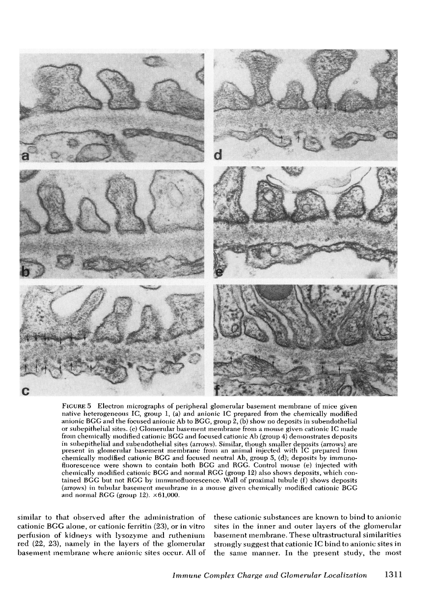 The effect of the charge of circulating immune complexes on glomerular localization was studied in a model of passive serum sickness. Preformed immune complexes of heterogeneous or restricted charge, prepared in vitro from isoelectrically focused or chemically modified proteins, were injected intravenously into mice. The distribution of immune complexes in the kidney was compared by immunofluorescence and electron microscopy. Cationic but not anionic or electrophoretically heterogeneous immune complexes gave rise to diffuse localization in the glomerular basement membrane. The binding in subepithelial and subendothelial sites correlated with the known distribution of structural anionic sites. The observations suggest that electrostatic interactions between fixed anionic sites and immune complexes may be an important factor in glomerular trapping. Alternative mechanisms based on initial localization of excess free cationic antigen cannot be completely excluded and are also considered.