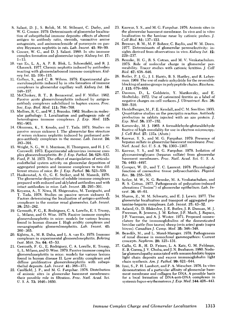 The effect of the charge of circulating immune complexes on glomerular localization was studied in a model of passive serum sickness. Preformed immune complexes of heterogeneous or restricted charge, prepared in vitro from isoelectrically focused or chemically modified proteins, were injected intravenously into mice. The distribution of immune complexes in the kidney was compared by immunofluorescence and electron microscopy. Cationic but not anionic or electrophoretically heterogeneous immune complexes gave rise to diffuse localization in the glomerular basement membrane. The binding in subepithelial and subendothelial sites correlated with the known distribution of structural anionic sites. The observations suggest that electrostatic interactions between fixed anionic sites and immune complexes may be an important factor in glomerular trapping. Alternative mechanisms based on initial localization of excess free cationic antigen cannot be completely excluded and are also considered.