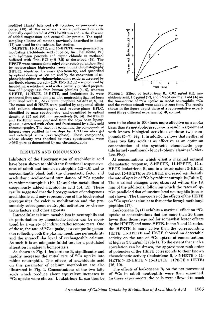 Products of the lipoxygenation of arachidonic acid that express neutrophil chemotactic activity were examined in vitro for effects on the uptake of 45Ca by rabbit peritoneal neutrophils. At optimally chemotactic concentrations, 5- and 11-hydroperoxyeicosatetraenoic acid, 11- and 12L-hydroxyeicosatetraenoic acid, and leukotriene B4 enhanced 45Ca uptake within 1 min by a mean of 212-694% of the values for control neutrophils incubated in buffer alone, as compared with 75% for 5(S)-hydroxyeicosatetraenoic acid and no effect for 15-hydroperoxyeicosatetraenoic acid and 15-hydroxyeicosatetraenoic acid. The approximate rank of potency of the factors stimulating 45Ca uptake was similar to that observed for chemotaxis. Leukotriene B4, in addition to stimulating the rate of 45Ca uptake into rabbit neutrophils, also displaced intracellular calcium. The net result of the leukotriene B4-induced changes in calcium homeostasis ws to elevate transiently the intracellular level of exchangeable calcium. That neutrophil lipoxygenase metabolites of endogenous arachidonic acid rapidly enhance the influx of 45Ca supports a possible role for such metabolites in general, and leukotriene B4 in particular, in the regulation of the intracellular levels of free calcium in the neutrophils and possibly in other hormonally sensitive cells in which this cation is a second messenger.