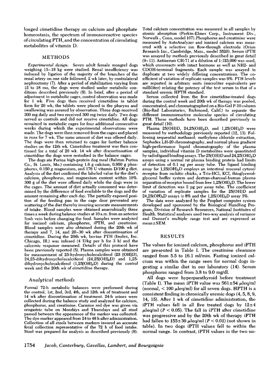 Chronic cimetidine therapy has been shown to suppress circulating concentrations of immunoreactive parathyroid hormone (iPTH) in hemodialysis patients. To evaluate the long-term metabolic effects of cimetidine treatment, we studied seven chronically uremic dogs for 20 wk. The dogs were studied under metabolic conditions before, during, and after cimetidine therapy. iPTH fell progressively in the five treated dogs from 536±70 μleq/ml (mean±SE) (nl < 100 μleq/ml) before treatment to 291±25 μleq/ml at 12 wk (P < 0.001) and 157±32 μleq/ml at 20 wk (P < 0.001). The control dogs showed no consistent change in iPTH. The fall in iPTH was not associated with a change in serum ionized calcium. However, serum phosphorus decreased from 5.7±0.9 mg/dl to 3.4±0.2 mg/dl by the 20th wk (P < 0.05). By contrast, the serum concentration of 1,25-dihydroxycholecalciferol increased in all treated dogs from 33.4±4.3 pg/ml to 51.8±2.4 pg/ml during treatment (P < 0.01). Calcium balance was negative in all seven dogs before cimetidine (−347±84 mg/72 h) and remained so in the control dogs; it became positive in the five treated dogs after 12 wk (1,141±409 mg/72 h) (P < 0.05). Phosphorus balance, 24-h fractional phosphate excretion, and creatinine clearance remained unchanged. Pooled samples of serum obtained during the control and 20th wk of therapy were fractionated by gel filtration and the eluates assayed for immunoreactivity. The decrease in iPTH was associated with a decrease in all the immunoreactive species, indicating suppression of parathyroid gland secretion.