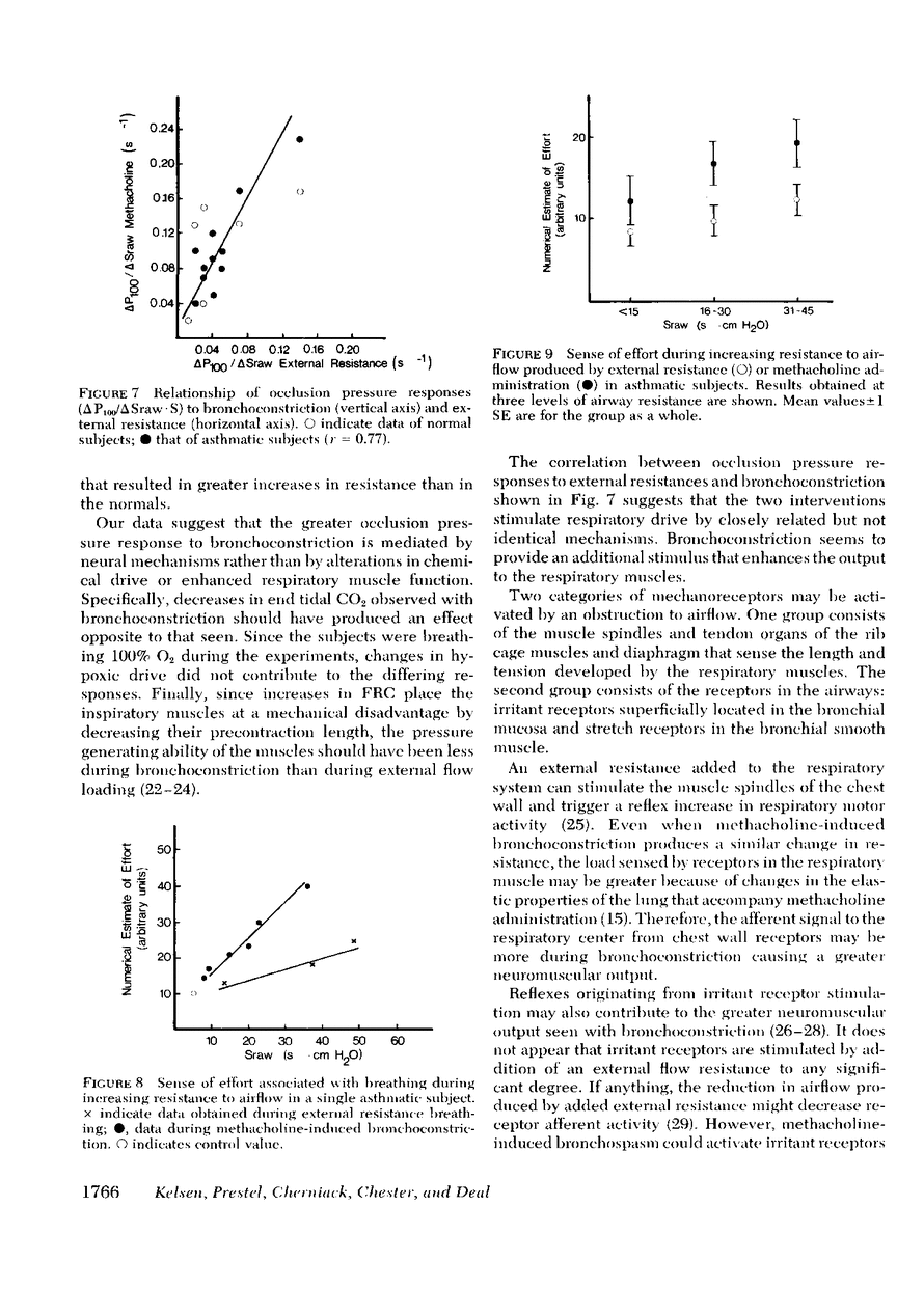 The effects of resistive loads applied at the mouth were compared to the effects of bronchospasm on ventilation, respiratory muscle force (occlusion pressure), and respiratory sensations in 6 normal and 11 asthmatic subjects breathing 100% O2. External resistive loads ranging from 0.65 to 13.33 cm H2O/liter per s were applied during both inspiration and expiration. Bronchospasm was induced by inhalation of aerosolized methacholine. Bronchospasm increased ventilation, inspiratory airflow, respiratory rate, and lowered PACO2. External resistive loading, on the other hand, reduced respiratory rate and inspiratory flow, but left ventilation and PACO2 unaltered. FRC increased to a greater extent with bronchospasm than external flow resistive loads. With both bronchospasm and external loading, occlusion pressure increased in proportion to the rise in resistance to airflow. However, the change in occlusion pressure produced by a given change in resistance and the absolute level of occlusion pressure at comparable levels of airway resistance were greater during bronchospasm than during external loading. These differences in occlusion pressure responses to the two forms of obstruction were not explained by differences in chemical drive or respiratory muscle mechanical advantage. Although the subjects' perception of the effort involved in breathing was heightened during both forms of obstruction to airflow, at any given level of resistance the sense of effort was greater with bronchospasm than external loading. Inputs from mechanoreceptors in the lungs (e.g., irritant receptors) and/or greater stimulation of chest wall mechanoreceptors as a result of increases in lung elastance may explain the differing responses elicited by the two forms of resistive loading.
