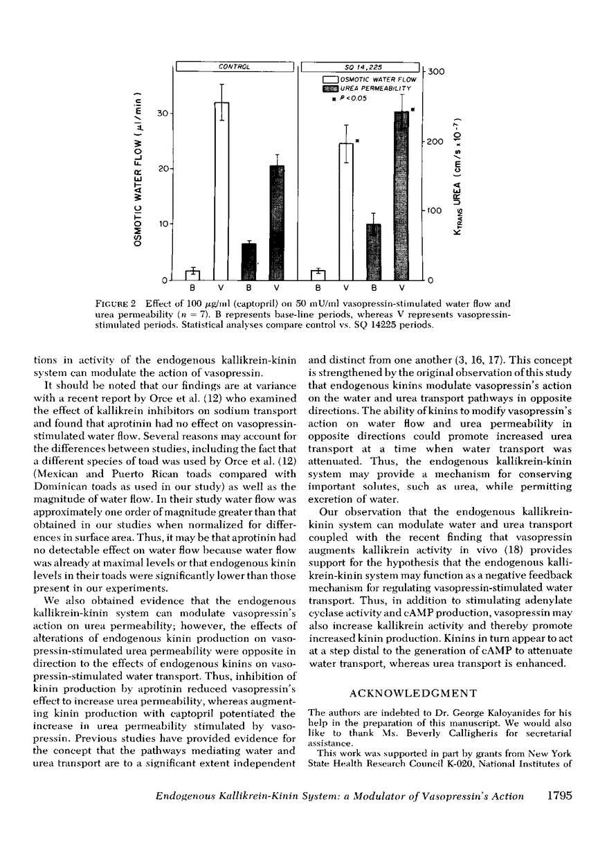 This study investigates the endogenous kallikrein-kinin system's role as a modulator of vasopressin action in the toad urinary bladder. Kalli-krein inhibition by aprotinin, which results in decreased kinin production, significantly increased both vasopressin and 8-Br-cyclic (c) AMP-stimulated water flow. Kinin potentiation by the kininase II inhibitor captopril (SQ 14225) significantly decreased vasopressin and 8-Br-cAMP-stimulated water flow. In contrast to water flow, vasopressin-stimulated urea permeability was decreased by aprotinin and increased by captopril. We conclude that the endogenous kallikrein-kinin system represents a significant modulator of vasopressin action and it permits separate control of vasopressin-stimulated water flow and solute transport.