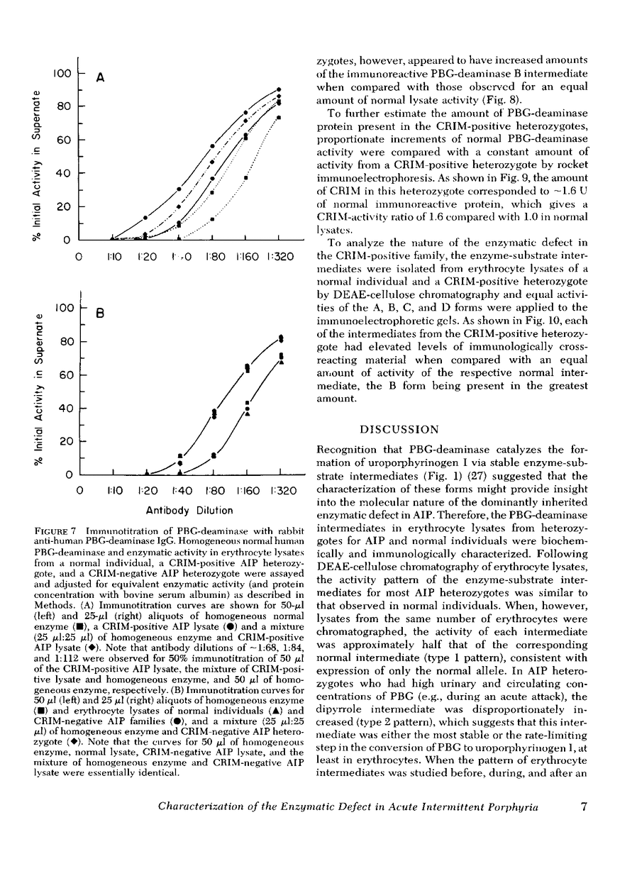 The molecular pathology of the porphobilinogen (PBG)-deaminase deficiency in heterozygotes for acute intermittent porphyria (AIP) was investigated by means of biochemical and immunologic techniques. The stable enzyme-substrate intermediates (A, B, C, D, and E) of PBG-deaminase were separated by anion-exchange chromatography of erythrocyte lysates from heterozygotes for AIP and normal individuals. In normal lysates, the intermediates eluted in a characteristic pattern with decreasing amounts of activity (A > B > C > D > E), the combined A and B intermediates representing >75% of total recovered activity. In contrast, two different profiles were observed in lysates from heterozygotes for AIP. In most heterozygotes, the elution profile was similar to that of normal individuals, but each intermediate was reduced ∼50%. A second profile in which the C intermediate had disproportionately higher activity than the A or B intermediates was observed in asymptomatic heterozygotes with high urinary levels of PBG (>5 μg/ml) as well as in heterozygotes during acute attacks. These findings suggested that the C intermediate (the dipyrrole-enzyme intermediate) may be rate limiting in the stepwise conversion of the monopyrrole, PBG, to the linear tetrapyrrole, hydroxymethylbilane. To investigate further the nature of the enzymatic defect in AIP, sensitive immunotitration and immunoelectrophoretic assays were developed with the aid of a rabbit anti-human PBG-deaminase IgG preparation produced against the homogeneous enzyme. Equal amounts of erythrocyte lysate activity from 32 heterozygotes for AIP from 22 unrelated families and 35 normal individuals were immunoelectrophoresed. There were no detectable differences in the amounts of cross-reactive immunologic material (CRIM) in lysates from the normal individuals and 25 heterozygotes from 21 of the 22 unrelated families with AIP. In contrast, when equal enzymatic activities were coimmunoelectrophoresed, all seven heterozygotes from one family had ∼ 1.6 times the amount of CRIM compared with that detected in normal lysates. Consistent with these findings, immunotitration studies also demonstrated similar quantities of noncatalytic CRIM in lysates from this AIP family. When equal activities of the individual A, B, C, and D enzyme-substrate intermediates from normal and CRIM-positive erythrocytes were immunoelectrophoresed, increased amounts of immunoreactive protein were observed for each intermediate, B > A ≃ C ≃ D, from the CRIM-positive AIP variants. On the basis of these findings, it is hypothesized that the enzymatic defect in the CRIM-positive AIP family resulted from a mutation in the structural gene for PBG-deaminase which altered the catalytic as well as a substrate binding site. These studies of the enzymatic defect provide the first demonstration of genetic heterogeneity in AIP.