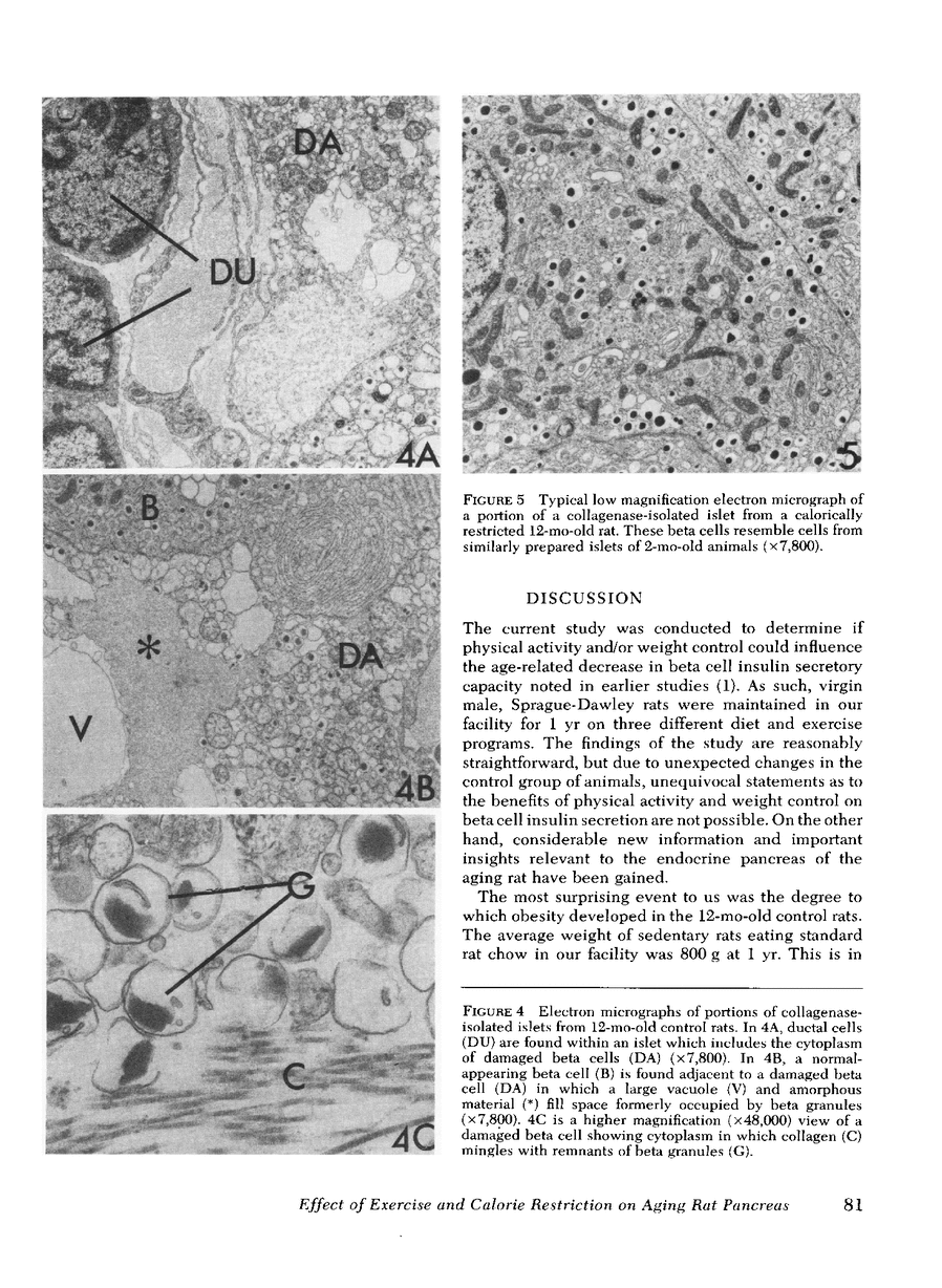 The current study was conducted to determine if physical activity and/or weight control could influence the age-related decrease in beta cell insulin response noted in earlier studies. As such, virgin, male Sprague-Dawley rats were maintained in our facility for 1 yr on three differential experimental programs; in the first group, control rats lived under standard laboratory conditions; the second group of rats ran several miles a day in exercise wheels, and the third group was given a calorie-restricted diet designed to keep the rats weight-matched with the exercising rats. The results showed that the 12-mo-old sedentary control rats weighed an average of 800g. From the time these rats were 4 mo old, they were significantly hyperinsulinemic, with mean (+/- SEM) serum insulin levels of 55 +/- 6 microU/ml. Morphological studies on the pancreas of these rats at the end of the year revealed enlarged, multilobulated, fibrotic islets. After collagenase digestion, the most normal-appearing islets from the 12-mo-old controls were used for insulin secretion studies, these islets showed significantly reduced glucose-induced insulin release (0.83 microU insulin/min per volume islet) compared with islets from young rats (1.80 microU insulin/min per volume islet). In contrast, 12-mo-old exercised or calorie-restricted rats weighed approximately 500 g and did not show the changes in serum insulin levels or pancreas pathology exhibited by the sedentary control animals. However, islets from the calorie-restricted group functioned in vitro no better than islets from he sedentary control group. Islets from the exercised rats were somewhat improved in this regard. In summary, we believe exercise and weight control diminishes the animals' need for insulin-resulting in youthful-appearing islets after a year's time. However, these regimes do not appear able to correct the beta cell decline in function previously described.