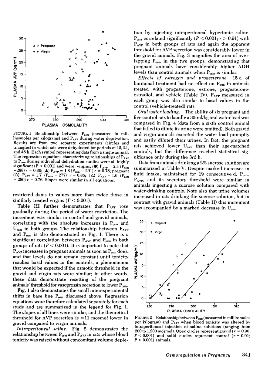 Osmoregulation was studied in near term and age-matched Sprague-Dawley rats. Basal plasma osmolality (Posm) and plasma sodium (PNa) were 281±3 mosmol/kg and 134±3 meq/liter, respectively, on the 20th gestational day compared with 292±3 mosmol/kg and 140±1 meq/liter in virgin animals (P < 0.001), whereas Purea and plasma water content were similar in pregnant and control rats. These differences could not be reproduced in animals receiving progesterone, estrone, or a combination of progesterone and estradiol for 2 wk.