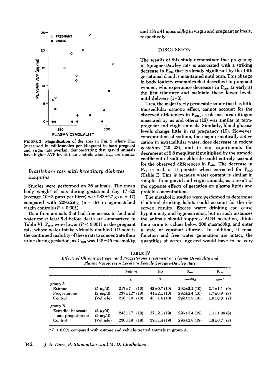 Osmoregulation was studied in near term and age-matched Sprague-Dawley rats. Basal plasma osmolality (Posm) and plasma sodium (PNa) were 281±3 mosmol/kg and 134±3 meq/liter, respectively, on the 20th gestational day compared with 292±3 mosmol/kg and 140±1 meq/liter in virgin animals (P < 0.001), whereas Purea and plasma water content were similar in pregnant and control rats. These differences could not be reproduced in animals receiving progesterone, estrone, or a combination of progesterone and estradiol for 2 wk.