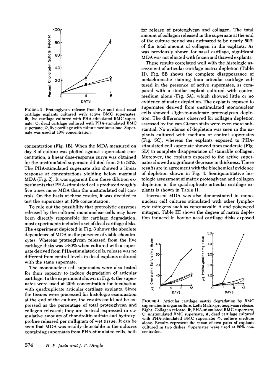 Human blood mononuclear cells (BMC) in short-term culture secrete one or more factors that induce degradation of matrix proteoglycan and collagen in cartilage explants in organ culture. Induction of matrix degradation took place both in nasal septum and articular cartilage explants in the presence of the mononuclear cell supernates. Cartilage degradation in this system was absolutely dependent on the presence of live chondrocytes. Matrix depletion did not occur in dead cartilage explants cultured with active supernates. Supernates obtained from unstimulated BMC showed variable cartilage matrix degrading activity (MDA). BMC stimulated with phytohemagglutinin (PHA) showed increased MDA, which in one dilution experiment was found to be five times higher than that in the unstimulated control supernate. Concanavalin A and pokeweed mitogen were also shown to stimulate release of MDA. Time experiments showed that most of the degrading activity was released by the mononuclear cells during the first day of culture. The cellular origin of MDA was investigated with the aid of partially purified BMC subpopulations. Removal of adherent cells resulted in a decrease of MDA release. Purified T lymphocytes failed to show enhanced MDA release in spite of their ability to mount a virtually intact proliferative response to PHA. Purified adherent cells also failed to show enhanced PHA-dependent MDA release. Nevertheless, restoration of PHA-dependent MDA release took place in reconstituted cell populations containing both T lymphocytes and monocytes. These experiments suggest that MDA may be released by adherent mononuclear cells, presumably monocytes, and that the PHA-dependent increase in MDA release may be mediated by T lymphocytes. Partial characterization of MDA by gel chromatography showed one active fraction corresponding to an apparent molecular weight ranging from 12,000 to 20,000. The fraction was also shown to degrade cartilage matrix only in the presence of live chondrocytes. These results demonstrate that factors released by human BMC mediate degradation of matrix proteoglycan and collagen in intact cartilage explants through chondrocyte activation. This pathogenic mechanism may play a role in in vivo cartilage destruction in chronic inflammatory joint diseases.