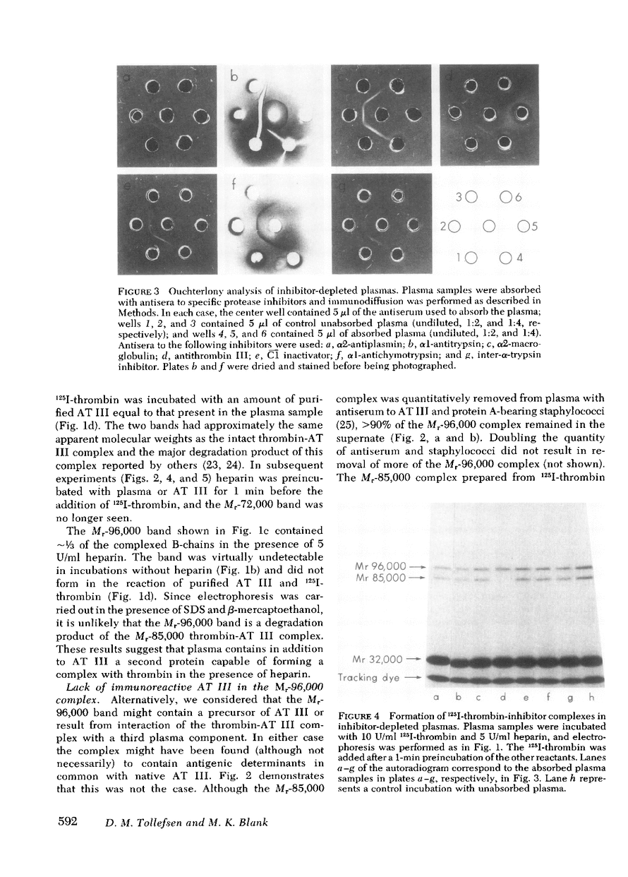 We have demonstrated that human plasma contains a heparin-dependent inhibitor of thrombin that is distinguishable from antithrombin III (AT III). When a 1:50 dilution of plasma was incubated with greater than or equal to 0.01 U/ml heparin and 1 U/ml 125I-thrombin, the labeled thrombin B-chains became incorporated into two complexes of Mr-96,000 and Mr-85,000 that were separated by polyacrylamide gel electrophoresis in the presence of sodium dodecyl sulfate and beta-mercaptoethanol. Neither complex was detectable at heparin concentrations less than 0.01 U/ml. When a limiting amount of 125I-thrombin was present, the proportion of radioactivity incorporated into each of the two complexes varied with the heparin concentration. Thus, the Mr-85,000 complex predominated at 0.01-5 U/ml heparin, whereas the Mr-96,000 complex predominated at 5-100 U/ml heparin. The Mr-85,000 complex reacted with antibodies to human AT III and comigrated with the purified thrombin-AT III complex. The Mr-96,000 complex did not react with antibodies to AT III or to alpha 1-antitrypsin, and it was detected in normal quantities after incubating 125I-thrombin with plasma immunodepleted of AT III, alpha 2-antiplasmin, alpha 2-macroglobulin, C1 inactivator, alpha 1-antichymotrypsin, or inter-alpha-trypsin inhibitor. The protein that combines with thrombin to form the Mr-96,000 complex was estimated to be present at a minimum concentration of 90 +/- 26 micrograms/ml (mean +/- SD) in identical to any of the known plasma protease inhibitors and that at relatively high heparin concentrations in vitro it reacts with thrombin more rapidly than does AT III.