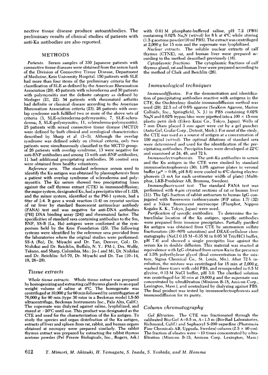 Autoantibodies in the serum from a patient with connective tissue disease have been used to define a high molecule weight acidic nuclear protein antigen. The antigen tentatively termed Ku, after the first two letters of patient's name, has distinct physicochemical properties and immunological specificities that distinguish it from previously reported antigens. The Ku antigen has an apparent 300,000 mol wt as determined by gel filtration and sucrose density gradient ultracentrifugation techniques. The antigen is destroyed by trypsin, mild heating, and pH variations greater than 10 and less than 5. Treatment with ribonuclease or deoxyribonuclease did not affect the antigenic reactivity. The Ku antigen was demonstrated in the soluble extracts of human, calf, and rabbit, but not of rat tissues. Purified antibody localized the Ku antigen within the nuclei of human liver where a "reticular" pattern of immunofluorescence was seen. Of 330 patients with various connective tissue diseases, 9 had precipitating antibodies to the Ku antigen. Preliminary results of clinical analysis indicated that antibody to the Ku antigen might become a useful marker for a group of patients with clinical characteristics of both polymyositis and scleroderma with a good prognosis.