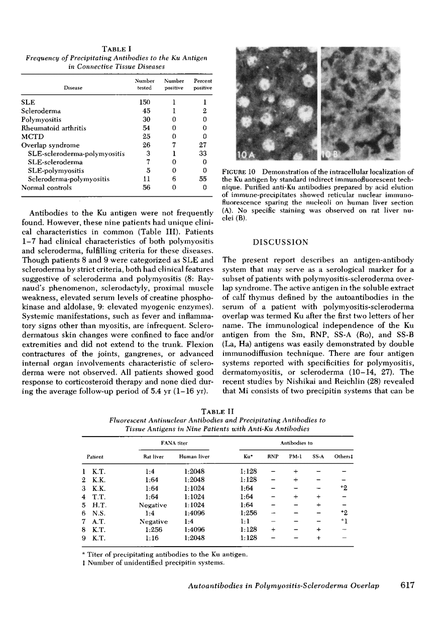 Autoantibodies in the serum from a patient with connective tissue disease have been used to define a high molecule weight acidic nuclear protein antigen. The antigen tentatively termed Ku, after the first two letters of patient's name, has distinct physicochemical properties and immunological specificities that distinguish it from previously reported antigens. The Ku antigen has an apparent 300,000 mol wt as determined by gel filtration and sucrose density gradient ultracentrifugation techniques. The antigen is destroyed by trypsin, mild heating, and pH variations greater than 10 and less than 5. Treatment with ribonuclease or deoxyribonuclease did not affect the antigenic reactivity. The Ku antigen was demonstrated in the soluble extracts of human, calf, and rabbit, but not of rat tissues. Purified antibody localized the Ku antigen within the nuclei of human liver where a "reticular" pattern of immunofluorescence was seen. Of 330 patients with various connective tissue diseases, 9 had precipitating antibodies to the Ku antigen. Preliminary results of clinical analysis indicated that antibody to the Ku antigen might become a useful marker for a group of patients with clinical characteristics of both polymyositis and scleroderma with a good prognosis.