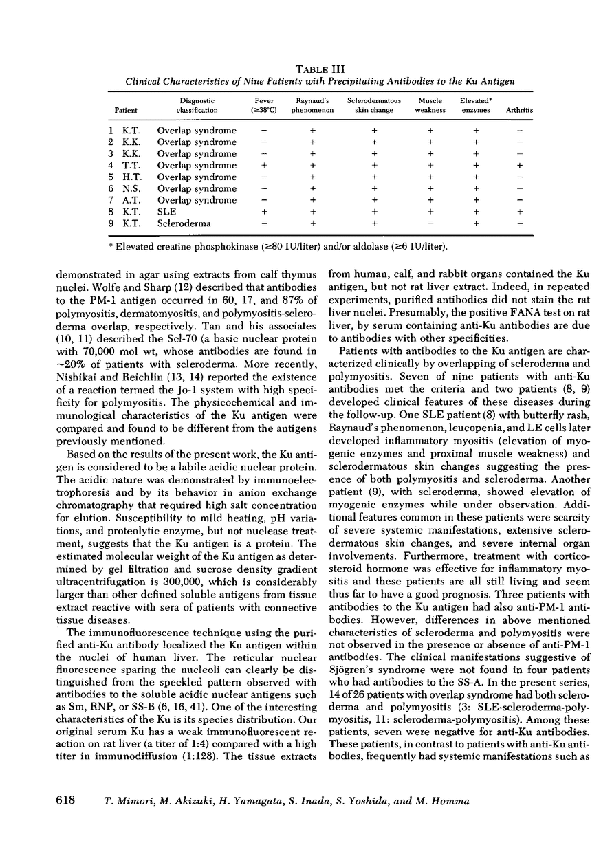 Autoantibodies in the serum from a patient with connective tissue disease have been used to define a high molecule weight acidic nuclear protein antigen. The antigen tentatively termed Ku, after the first two letters of patient's name, has distinct physicochemical properties and immunological specificities that distinguish it from previously reported antigens. The Ku antigen has an apparent 300,000 mol wt as determined by gel filtration and sucrose density gradient ultracentrifugation techniques. The antigen is destroyed by trypsin, mild heating, and pH variations greater than 10 and less than 5. Treatment with ribonuclease or deoxyribonuclease did not affect the antigenic reactivity. The Ku antigen was demonstrated in the soluble extracts of human, calf, and rabbit, but not of rat tissues. Purified antibody localized the Ku antigen within the nuclei of human liver where a "reticular" pattern of immunofluorescence was seen. Of 330 patients with various connective tissue diseases, 9 had precipitating antibodies to the Ku antigen. Preliminary results of clinical analysis indicated that antibody to the Ku antigen might become a useful marker for a group of patients with clinical characteristics of both polymyositis and scleroderma with a good prognosis.