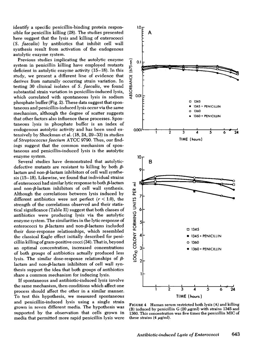 Enterococci are resistant to penicillin killing in vivo and in vitro. Because some bacteria resistant to penicillin killing have reduced autolytic activity, we examined the lysis of clinical enterococcal isolates suspended in buffer (spontaneous lysis), and compared it with their susceptibility to antibiotic-induced lysis and killing. We found significant correlations between spontaneous and antibiotic-induced lysis, using five antibiotics that inhibit cell wall synthesis (penicillin, cephalothin, bacitracin, cycloserine, and vancomycin). Among isolates, strains more rapidly lysed by one antibiotic were more rapidly lysed by the other antibiotics, and more susceptible to spontaneous lysis. In studies involving a single strain grown in different media, spontaneous lysis also correlated closely with antibiotic-induced lysis. These results are consistent with a common mechanism for spontaneous and antibiotic-induced lysis, such as the autolytic enzyme system. Human serum was one of the least permissive media tested for enterococcal growth and antibiotic-induced lysis and killing. We suggest that the inhibitory effect of human serum on growth and the activation of the enterococcal autolytic enzyme system may be a critical factor in the resistance of enterococcal endocarditis to treatment with penicillin alone.