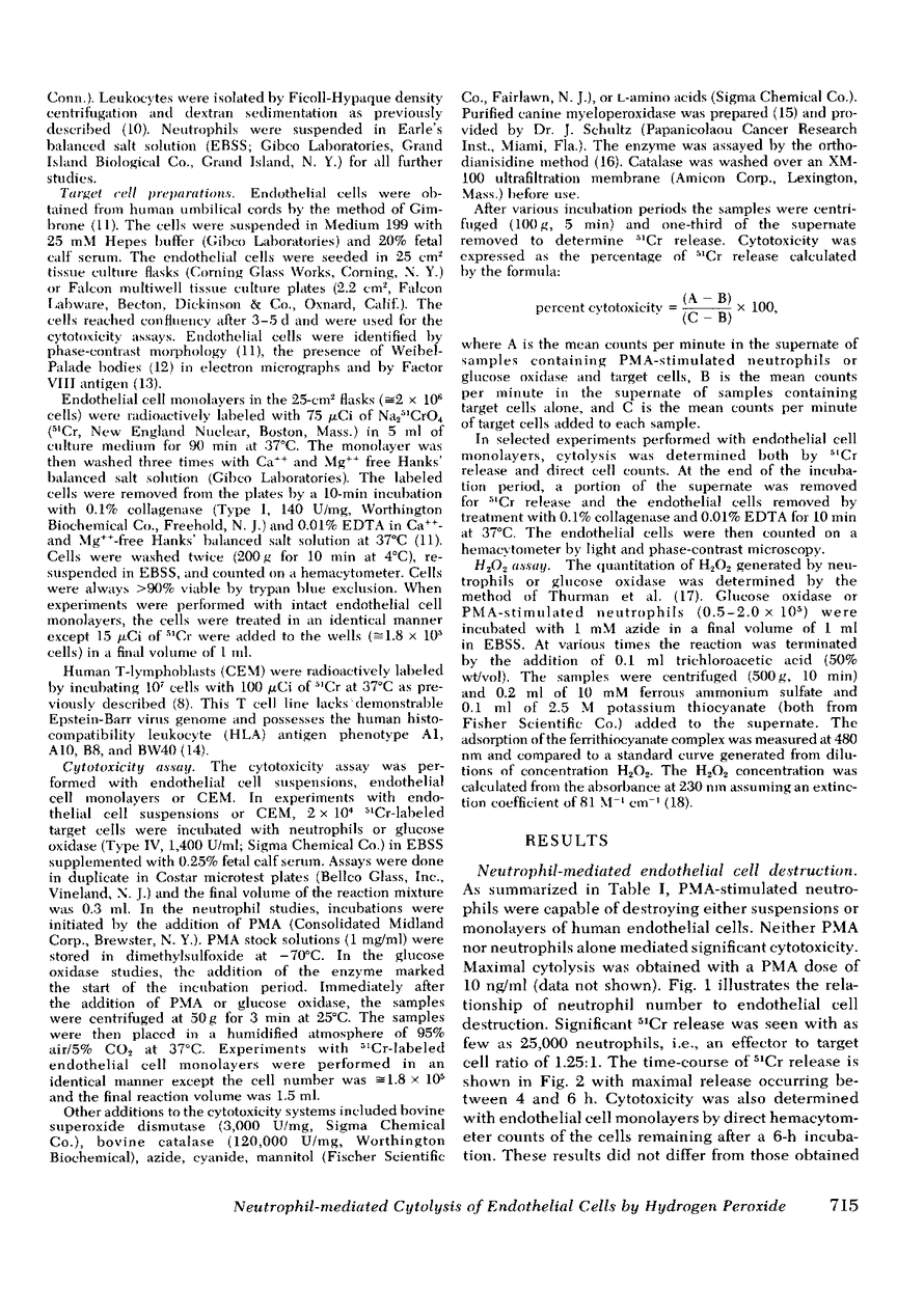 Human neutrophils stimulated with phorbol myristate acetate were able to destroy suspensions or monolayers of cultured human endothelial cells. Neutrophil-mediated cytotoxicity was related to phorbol myristate acetate concentration, time of incubation and neutrophil number. Cytolysis was prevented by the addition of catalase, while superoxide dismutase had no effect on cytotoxicity. The addition of the heme-enzyme inhibitors, azide or cyanide, markedly stimulated neutrophil-mediated damage while exogenous myeloperoxidase failed to stimulate cytolysis. Neutrophils isolated from patients with chronic granulomatous disease did not destroy the endothelial cell targets while myeloperoxidase-deficient neutrophils successfully mediated cytotoxicity. Endothelial cell damage mediated by the myeloperoxidase deficient cells was also inhibited by catalase but not superoxide dismutase. The addition of purified myeloperoxidase to the deficient cells did not stimulate cytotoxicity. Glucose-glucose oxidase, an enzyme system capable of generating hydrogen peroxide, could replace the neutrophil as the cytotoxic mediator. The addition of myeloperoxidase at low concentrations of glucose oxidase did not increase cytolysis, but at the higher concentrations of glucose oxidase it stimulated cytotoxicity. The destruction of endothelial cells by the glucose oxidase-myeloperoxidase system was inhibited by the addition of hypochlorous acid scavengers. In contrast, neutrophil-mediated cytolysis was not effectively inhibited by the hypochlorous acid scavengers. Based on these observations, we propose that human neutrophils can destroy cultured human endothelial cells by generating cytotoxic quantities of hydrogen peroxide.