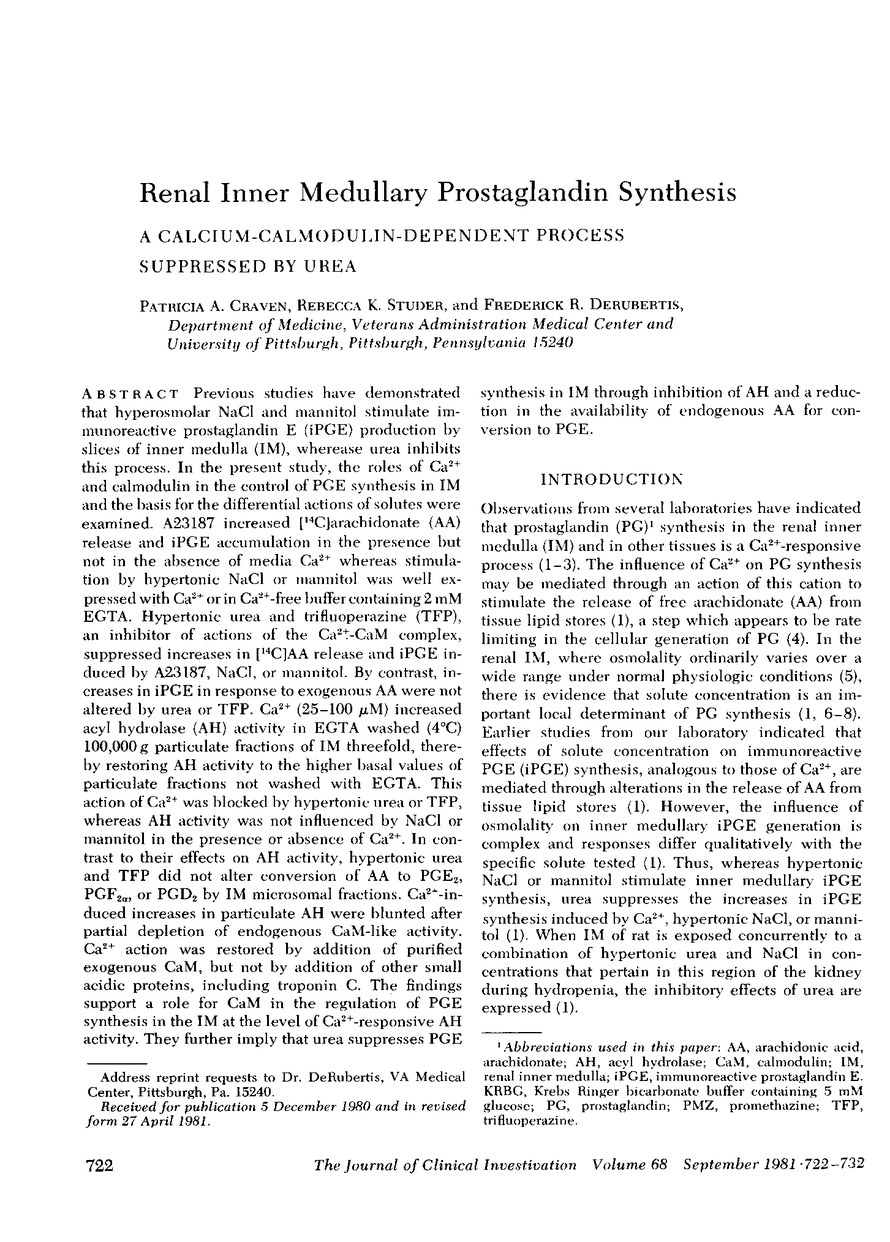 Previous studies have demonstrated that hyperosmolar NaCl and mannitol stimulate immunoreactive prostaglandin E (iPGE) production by slices of inner medulla (IM), whereas urea inhibits this process. In the present study, the roles of Ca2+ and calmodulin in the control of PGE synthesis in IM and the basis for the differential actions of solutes were examined. A23187 increased [14C]arachidonate (AA) release and iPGE accumulation in the presence but not in the absence of media Ca2+ whereas stimulation by hypertonic NaCl or mannitol was well expressed with Ca2+ or in Ca2+-free buffer containing 2 mM EGTA. Hypertonic urea and trifluoperazine (TFP), an inhibitor of actions of the Ca2+-CaM complex, suppressed increases in [14C]AA release and iPGE induced by A23187, NaCl, or mannitol. By contrast, increases in iPGE in response to exogenous AA were not altered by urea or TFP. Ca2+ (25-100 microM) increased acyl hydrolase (AH) activity in EGTA washed (4 degrees C) 100,000 g particulate fractions of IM threefold, thereby restoring AH activity to the higher basal values of particulate fractions not washed with EGTA. This action of Ca2+ was blocked by hypertonic urea of TFP, whereas AH activity was not influenced by NaCl or mannitol in the presence or absence of Ca2+. In contrast to their effects on AH activity, hypertonic urea and TFP did not alter conversion of AA to PGE2, PGF2 alpha, or PGD2 by IM microsomal fractions. Ca2+-induced increases in particulate AH were blunted after partial depletion of endogenous CaM-like activity. Ca2+ action was restored by addition of purified exogenous CaM, but not by addition of other small acidic proteins, including troponin C. The findings support a role for CaM in the regulation of PGE synthesis in the IM at the level of Ca2+-responsive AH activity. They further imply that urea suppresses PGE synthesis in IM through inhibition of AH and a reduction in the availability of endogenous AA for conversion to PGE.