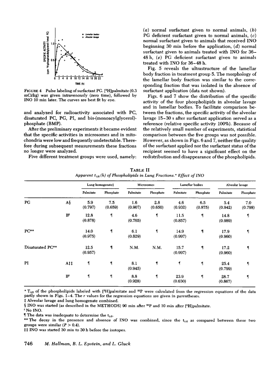 Turnover and clearance of lung surfactant phospholipids were studied with particular reference to myoinositol-induced perturbation in the acidic phospholipids. Administration of myoinositol decreased [3H]palmitate and [32P]phosphate incorporation into phosphatidylglycerol by 80-90% in whole lung, and by 94-99% in lamellar bodies and in alveolar lavage. The increased incorporation of radioactive isotopes into phosphatidylinositol following myoinositol, was inverse to the decrease in phosphatidyl-glycerol incorporation. Myoinositol treatment affected neither content nor labeling of phosphatidylcholine or disaturated phosphatidylcholine as studied within 50 h of administration. Phosphatidylglycerol was pulse labeled by intravenous [32P]phosphate and [3H]palmitate, followed by myoinositol. The biological half-lives of phosphatidylglycerol in the microsomal fraction, lamellar bodies, and alveolar lavage were 1.6, 4.6, 5.4 h (with 3H), and 2.8, 6.5, 7.0 h (with 32P), respectively.