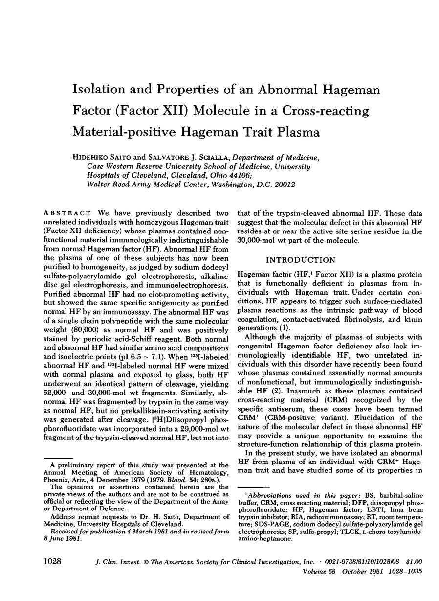 We have previously described two unrelated individuals with homozygous Hageman trait (Factor XII deficiency) whose plasmas contained nonfunctional material immunologically indistinguishable from normal Hageman factor (HF). Abnormal HF from the plasma of one these subjects has now been purified to homogeneity, as judged by sodium dodecyl sulfate-polyacrylamide gel electrophoresis, alkaline disc gel electrophoresis, and immunoelectrophoresis. Purified abnormal HF had no clot-promoting activity, but showed the same specific antigenicity as purified normal HF by an immunoassay. The abnormal HF was of a single chain polypeptide with the same molecular weight (80,000) as normal HF and was positively stained by periodic acid-Schiff reagent. Both normal and abnormal HF had similar amino acid compositions and isoelectric points (pI 6.5 approximately 7.1). When 125I-labeled abnormal HF and 131I-labeled normal HF were mixed with normal plasma and exposed to glass, both HF underwent an identical pattern of cleavage, yielding 52,000- and 30,000-mol wt fragments. Similarly, abnormal HF was fragmented by trypsin in the same way as normal HF, but no prekallikrein-activating activity was generated after cleavage. [3H]Diisopropyl phosphorofluoridate was incorporated into a 29,000-mol wt fragment of the trypsin-cleaved normal HF, but not into that of the trypsin-cleaved abnormal HF. These data suggest that the molecular defect in this abnormal HF resides at or near the active site serine residue in the 30,000-mol wt part of the molecule.