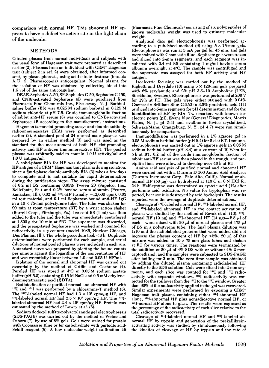 We have previously described two unrelated individuals with homozygous Hageman trait (Factor XII deficiency) whose plasmas contained nonfunctional material immunologically indistinguishable from normal Hageman factor (HF). Abnormal HF from the plasma of one these subjects has now been purified to homogeneity, as judged by sodium dodecyl sulfate-polyacrylamide gel electrophoresis, alkaline disc gel electrophoresis, and immunoelectrophoresis. Purified abnormal HF had no clot-promoting activity, but showed the same specific antigenicity as purified normal HF by an immunoassay. The abnormal HF was of a single chain polypeptide with the same molecular weight (80,000) as normal HF and was positively stained by periodic acid-Schiff reagent. Both normal and abnormal HF had similar amino acid compositions and isoelectric points (pI 6.5 approximately 7.1). When 125I-labeled abnormal HF and 131I-labeled normal HF were mixed with normal plasma and exposed to glass, both HF underwent an identical pattern of cleavage, yielding 52,000- and 30,000-mol wt fragments. Similarly, abnormal HF was fragmented by trypsin in the same way as normal HF, but no prekallikrein-activating activity was generated after cleavage. [3H]Diisopropyl phosphorofluoridate was incorporated into a 29,000-mol wt fragment of the trypsin-cleaved normal HF, but not into that of the trypsin-cleaved abnormal HF. These data suggest that the molecular defect in this abnormal HF resides at or near the active site serine residue in the 30,000-mol wt part of the molecule.