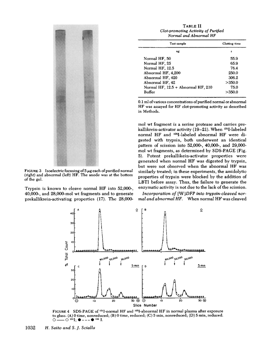 We have previously described two unrelated individuals with homozygous Hageman trait (Factor XII deficiency) whose plasmas contained nonfunctional material immunologically indistinguishable from normal Hageman factor (HF). Abnormal HF from the plasma of one these subjects has now been purified to homogeneity, as judged by sodium dodecyl sulfate-polyacrylamide gel electrophoresis, alkaline disc gel electrophoresis, and immunoelectrophoresis. Purified abnormal HF had no clot-promoting activity, but showed the same specific antigenicity as purified normal HF by an immunoassay. The abnormal HF was of a single chain polypeptide with the same molecular weight (80,000) as normal HF and was positively stained by periodic acid-Schiff reagent. Both normal and abnormal HF had similar amino acid compositions and isoelectric points (pI 6.5 approximately 7.1). When 125I-labeled abnormal HF and 131I-labeled normal HF were mixed with normal plasma and exposed to glass, both HF underwent an identical pattern of cleavage, yielding 52,000- and 30,000-mol wt fragments. Similarly, abnormal HF was fragmented by trypsin in the same way as normal HF, but no prekallikrein-activating activity was generated after cleavage. [3H]Diisopropyl phosphorofluoridate was incorporated into a 29,000-mol wt fragment of the trypsin-cleaved normal HF, but not into that of the trypsin-cleaved abnormal HF. These data suggest that the molecular defect in this abnormal HF resides at or near the active site serine residue in the 30,000-mol wt part of the molecule.