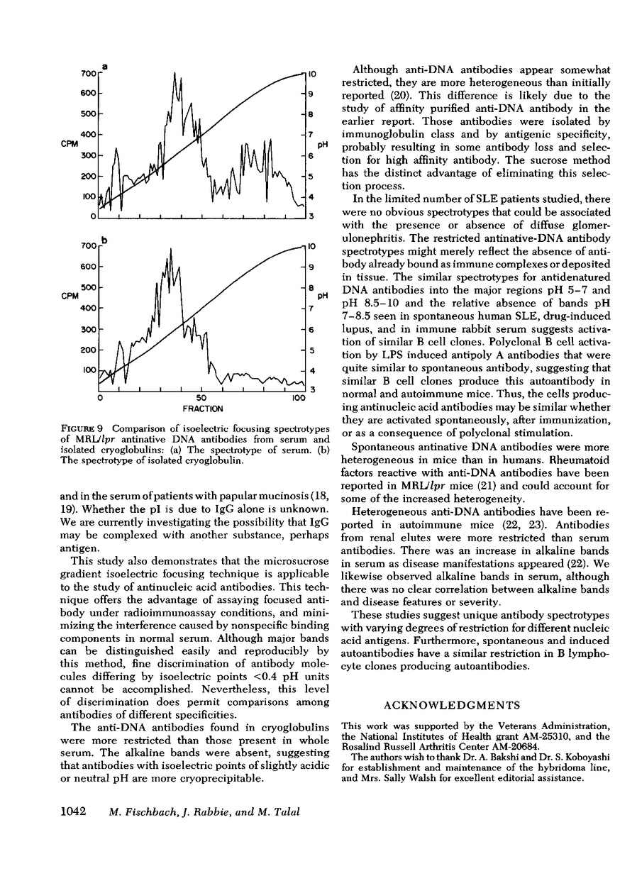 Sera from patients with systemic lupus erythematosus and from mice spontaneously developing lupus were subjected to isoelectric focusing by a microsucrose gradient method. The spectrotypes of human antibodies to native DNA, denatured DNA, and polyriboadenylic acid (poly A) were compared. Antibodies to native DNA and denatured DNA focused into two regions whose boundaries were pH 5.0-7.0 and pH 8.5-10.0. Antinative DNA antibodies were more homogeneous than antidenatured DNA antibodies. Anti-DNA antibodies in cryoglobulins showed more restriction than those present in serum. There was no relationship between spectrotype and pattern of disease expression. Murine antibodies to native DNA were more heterogeneous than human anti-DNA antibodies. The spectrotypes of antidenatured DNA antibodies from patients with systemic lupus erythematosus or drug induced lupus, or from an immunized rabbit, were similar. Likewise, antibodies to poly A were similar in both human and murine lupus. In contrast to anti-DNA, antibodies to poly A were restricted and focused only in the alkaline range (pH 9.5-10.0). The spectrotype of antipoly A antibodies induced by lipopolysaccharide were comparable but had an additional small band at pH 6.2. Our results suggest unique antibody spectrotypes with varying degrees of restriction for different nucleic acid antigens. Furthermore, spontaneous and induced autoantibodies have similar spectrotypes. Thus, the B cell clones producing antinucleic acid antibodies may be similar whether they are activated spontaneously, following immunization, or as a consequence of polyclonal stimulation.