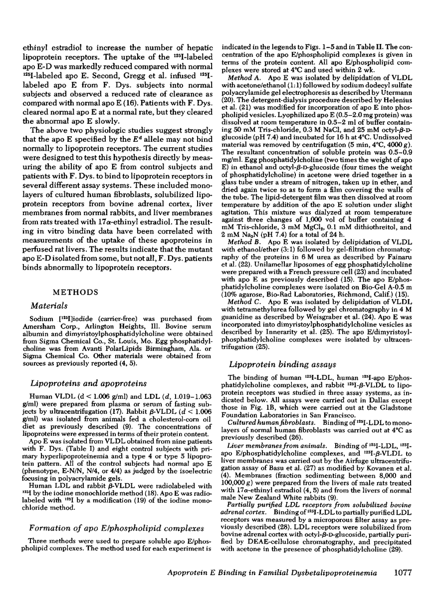 Patients with familial dysbetalipoproteinemia (F. Dys.), also called familial type 3 hyperlipoproteinemia, are homozygous for a mutant allele, Ed, that specifies an abnormal form of apoprotein (apo) E, a prominent constituent of remnant lipoproteins derived from very low density lipoproteins (VLDL) and chylomicrons. Apo E is thought to mediate the removal of remnant lipoproteins from the plasma by virtue of its ability to bind to hepatic lipoprotein receptors. In F. Dys. patients, remnant-like lipoproteins accumulate, apparently because of delayed clearance by the liver. In the current studies, we show that the abnormal protein specified by the Ed allele (apo E-D) from some, but not all, patients with F. Dys. has a markedly deficient ability to bind to low density lipoprotein (LDL) receptors. Apo E was isolated from eight control subjects and nine patients with F. Dys. and incorporated into phospholipid complexes. The complexes were tested for their ability to compete with human 125I-LDL or rabbit 125I-beta-VLDL fo binding to LDL receptors in four assay systems: cultured human fibroblasts, solubilized receptors from bovine adrenal cortex, liver membranes from rats treated with 17 alpha-ethinyl estradiol, and liver membranes from normal rabbits. The apo E-D from six of the nine patients with F. Dys. showed binding affinities for LDL receptors that were reduced by greater than 98% in all receptor assays (group 1 patients). All of these group 1 patients were unequivocally of phenotype apo E-D/D by the criterion of isoelectric focussing. The apo E from the three other F. Dys. patients showed a near normal binding ability in all four of the receptor assays (group 2 patients). One of these group 2 patients appeared to have the apo E-D/D phenotype by isoelectric focussing. In the other two patients in group 2, apo E-D was the predominant protein (phenotype, apo E-D/D), but traces of protein in the region corresponding to normal apo E (apo E-N) were also present. The difference between group 1 and group 2 patients was also apparent when the apo E was iodinated and tested directly for binding to liver membranes from rats treated with 17 alpha-ethinyl estradiol. The 125I-labeled apo E from a group 2 patient, but not a group 1 patient, showed enhanced uptake when perfused through the liver of an estradiol-treated rate, indicating that the receptor binding ability of apo E correlated with uptake in the intact liver. The current studies allow the subdivision of patients with F. Dys. into two groups. In group 1, the elevated plasma level of remnants appears to be due to a diminished receptor binding activity of the abnormal protein specified by the Ed allele; in group 2 patients, the cause of the elevated plasma level of remnants remains to be explained.