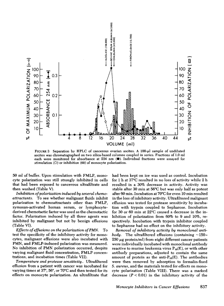 Individuals with cancer have previously been shown to have abnormal chemotactic responsiveness. Surgical removal of the tumor often resulted in normalization of monocyte function, which suggests that human neoplasms might inhibit monocyte chemotaxis by release of soluble mediators. We therefore examined the effects of cancerous effusions on monocyte polarization, i.e., the rapid change in monocyte morphology from round to a triangular "motile" configuration in response to chemoattractants. All 17 malignant effusions, representing 15 tumor types, inhibited monocyte polarization induced by the chemoattractant N-formyl-methionyl-leucyl-phenylalanine by 45-89% (mean 55.9 +/- 12.7%, P less than 0.01) in blinded assays. None of 17 benign effusions signigicantly inhibited polarization (0-15%, mean 6.2 +/- 4.2%). Dilutions of cancerous effusions as low as 1:200 produced inhibition that was time, temperature, and dose dependent . Monocyte polarization induced by activated serum or by chemotactic lymphokine was also blocked by cancerous effusions. The inhibitory activity affected the monocyte directly, and did not destroy the chemoattractant or block the polarization of granulocytes to chemotactic factors. High pressure liquid chromatography of five cancerous fluids revealed three peaks of inhibitory activity: greater than or equal to 200,000, 46,000 +/- 13,000, and 21,000 +/- 3,000 daltons. Fractionation of noncancerous effusions revealed only small amounts of the highest molecular weight inhibitory activity. The inhibitory activity in cancerous effusion was heat stable (56 degrees C, 30 min), trypsin sensitive, and could be absorbed by three different monoclonal antibodies reactive to P15(E), a structural component of type C retroviruses. In contrast, six monoclonal antibodies with other specificities had no effect on the inhibitors of polarization. This study demonstrates that human cancerous effusions contain novel proteins that are potent inhibitors of monocyte function and that are recognized by antibodies reactive to the P15(E) component of retroviruses. By producing such factors, tumor cells may subvert monocyte-mediated surveillance.