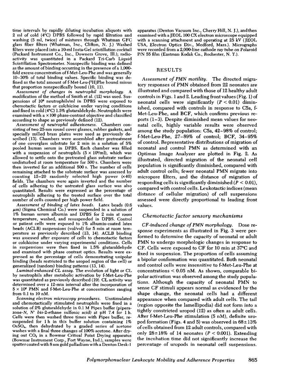 To determine the mechanism(s) of diminished, stimulated, and directed migration of neonatal (N) polymorphonuclear leukocytes (PMN), chemotactic factor (CF) sensory and PMN effector functions were studied in healthy N and adult or maternal controls (C). N PMN demonstrated high affinity binding for N-formyl-methionyl-leucyl-[3H]phenylalanine (fMLP), which was saturable between 40 and 100 nM as observed with C PMN. The kinetics of binding and the characteristics of dissociation of binding by N PMN were equivalent to control PMN. Both "threshold" and "peak" concentrations (1 and 10 nM, respectively) of fMLP effected comparable PMN chemiluminescence among neonates and controls. An equivalent threshold concentration (0.05 nM) of fMLP effected N and C PMN shape change in suspension, and a maximally effective concentration (5 nM) induced comparable bipolar configuration, although uropod formation was only 38 +/- 8% of N PMN, compared with 73 +/- 11% of C PMN (P less than 0.01). Striking abnormalities of N PMN adherence were identified: mean +/- SD base-line (unstimulated) N adherence values (39 +/- 8%) were equal to C (38 +/- 9%), but diminished increments in response to single CF stimuli were noted among N (fMLP: 42 +/- 7% (N), 70 +/- 11% (C); C5a: 41 +/- 6% (N), 68 +/- 6% (C); BCF: 41 +/- 6% (N), 63 +/- 9% (C), P less than 0.01 for each CF). On sequential exposure to increasing concentrations of CF N PMN failed to demonstrate expected decreased adherence values; sequential stimuli with fMLP (0.1 nM, 10 nM) or C5a (8 microgram protein/ml, 32 microgram protein/ml) effected mean +/- 1 SD values of 51 +/- 9% (N), 30 +/- 9% (C), and 34 +/- 10 (N), 48 +/- 14% (C), respectively. As demonstrated with a latex bead-binding technique, N PMN failed to redistribute adhesion sites to the cell's tail under the same experimental conditions; in 21 N samples studied, restricted unipolar binding occurred in 33 +/- 8% (fMLP) or 37 +/- 7% (C5a) of PMN in contrast to C values of 70% (fMLP), or 71% (C5a), P less than 0.001. Similar findings were observed when PMN were preincubated with colchicine (25 microgram/ml); expected diminished adherence scores (compared with base-line values) were demonstrated with C PMN but not with N cells, P less than 0.01. Additionally colchicine-induced redistribution of adhesion sites as was observed with C samples (72 +/- 14% unipolar binding) was significantly (P less than 0.001) less among N PMN (31 +/- 11% unipolar binding). These investigations indicate that CF sensory mechanisms of N PMN are normal, compared with healthy adult or maternal controls. Diminished stimulated locomotion of the N PMN may be functionally related to reduced modulation of cell adhesiveness by chemotactic stimulation.