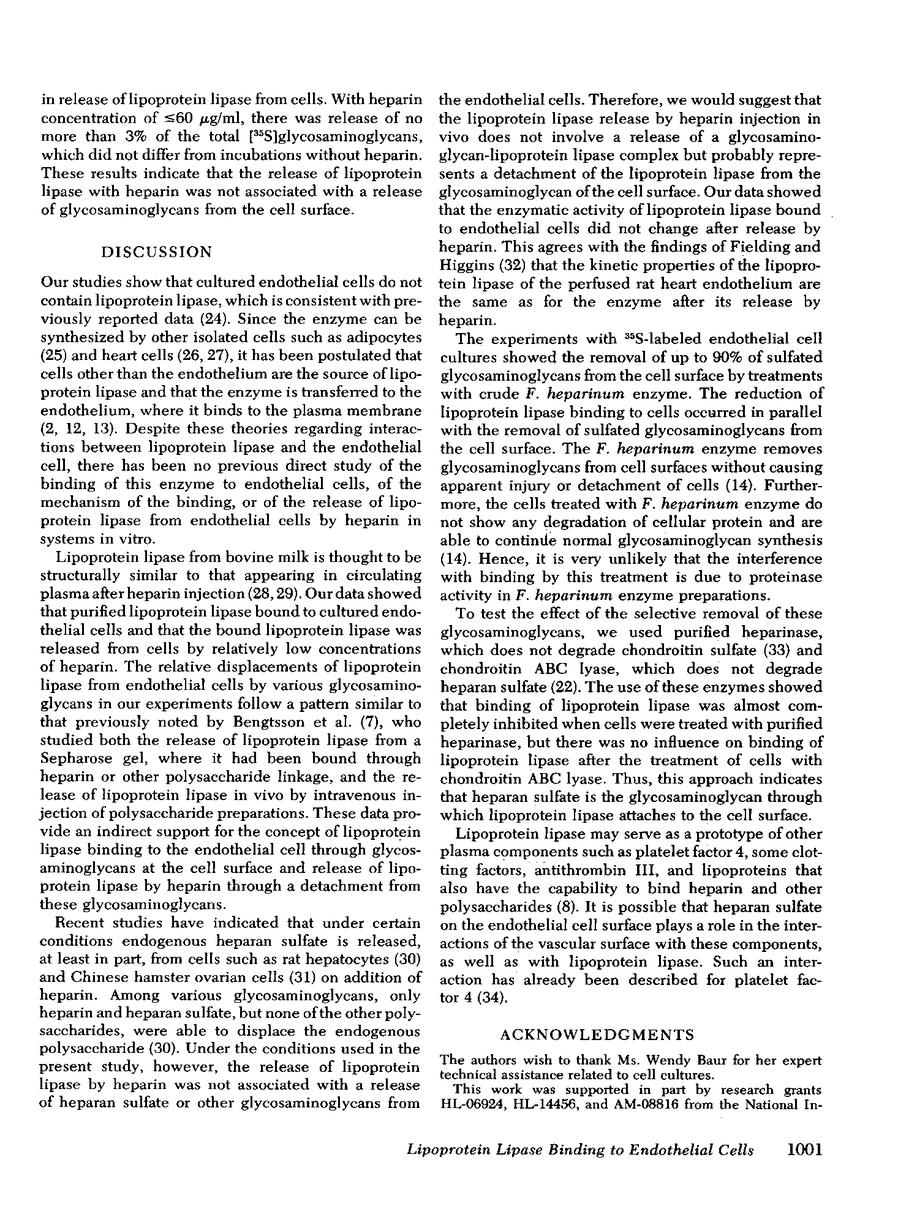 It has been postulated that lipoprotein lipase, an enzyme important in the uptake of fatty acids into tissues, is bound to the vascular endothelial cell surface and that this binding occurs through attachment to heparinlike glycosaminoglycans. Furthermore, it is thought that heparin releases the enzyme from its attachment to the endothelium into the circulation. These hypotheses have never been tested directly in cell systems in vitro. In the present study we have directly evaluated the interaction of lipoprotein lipase, purified from bovine skim milk with monolayer cultures of endothelial cells, isolated from bovine pulmonary artery. Endothelial cells in primary culture had no intrinsic lipoprotein lipase activity but were able to bind lipoprotein lipase quantitatively. The binding reached equilibrium and was saturable at 0.24 nmol of lipoprotein lipase/mg of cell protein. The concentration of lipoprotein lipase at half-maximal binding was 0.52 microM. Bound lipoprotein lipase could be detached from cultured cells by increasing concentrations of heparin, and at and above 0.6 microgram/ml of heparin, 90% of the cell-bound lipoprotein lipase activity was released. Heparan sulfate and dermatan sulfate released the enzyme to a lesser extent and chondroitin sulfate caused little, if any, release of lipoprotein lipase. The release of lipoprotein lipase with heparin was not associated with a release of [3S]glycosaminoglycans from 35S-prelabeled cells. Reductions of lipoprotein lipase binding to endothelial cells and of cell surface-associated [3S]glycosaminoglycans in 35S-prelabeled cells occurred in parallel both when cells were pretreated with crude Flavobacterium heparinum enzyme before lipoprotein lipase binding and when cells were treated with this enzyme after lipoprotein lipase binding. The removal of heparan sulfate from the cell surface by purified heparinase totally inhibited the binding of lipoprotein lipase by endothelial cells, but the removal of chondroitin sulfate by chondroitin ABC lyase had no effect on this binding. These results provide direct evidence for lipoprotein lipase attachment to endothelial cells through heparan sulfate on the cell surface, and provide evidence for the release of lipoprotein lipase by heparin through a detachment from this binding site.