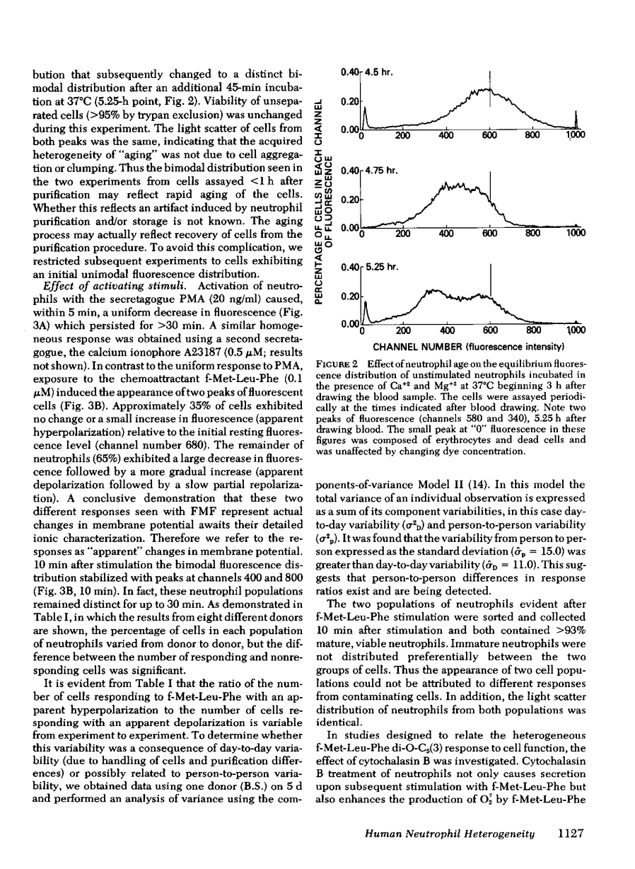 Previous studies of neutrophil nitroblue tetrazolium dye reduction in response to endotoxin and rosetting of IgG-coated erythryocytes have suggested functional heterogeneity of peripheral blood neutrophils. In the following study we utilized flow microfluorometry and the membrane potential-sensitive fluorescent dye 3-3′-dipentyloxacarbocyanine to assess the heterogeneity of neutrophils upon activation by a variety of stimuli. Unstimulated neutrophils from normal subjects exhibited a unimodal distribution of fluorescence, suggesting that all the cells possessed the same resting membrane potential. As neutrophils aged (>5 h), some cells lost fluorescence producing a bimodal distribution. In studies with fresh cells, the secretagogue phorbol myristate acetate (20 ng/ml) stimulated a uniform loss of fluorescence (apparent depolarization). The chemoattractant N-formyl-methionyl-leucyl-phenylalanine (f-Met-Leu-Phe) (0.1 μM) caused the neutrophils to assume and maintain (for > 30 min) a bimodal fluorescence distribution in which 65±5% of the neutrophils first decreased and then increased fluorescence (apparent depolarization/partial repolarization), and 35±5% of the cells exhibited either an increase in fluorescence (apparent hyperpolarization) or no change. Treatment of neutrophils with cytochalasin B before stimulation caused the cells to respond homogeneously to f-Met-Leu-Phe. Additional studies using neutrophils from patients with chronic granulomatous disease, which exhibit abnormal membrane potential responses, indicated that this defect affected all such neutrophils uniformly. These observations demonstrate the need to investigate the physiological significance of the heterogeneity of neutrophil function and indicate that the f-Met-Leu-Phe-induced changes in membrane potential observed in bulk population cell studies are the summation of two different responses.