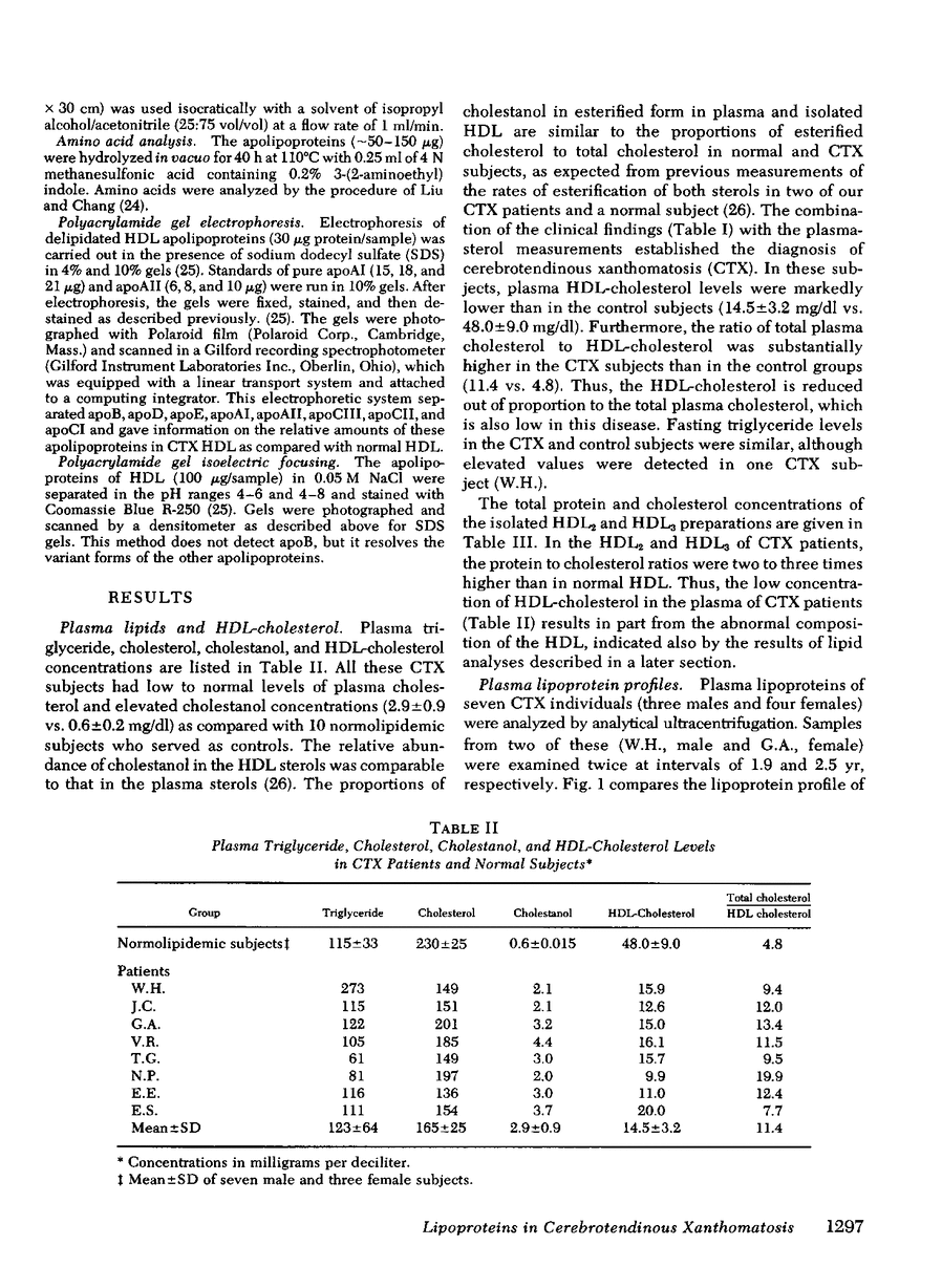 The plasma lipoprotein profiles and high density lipoproteins (HDL) were characterized in patients with the genetic disease cerebrotendinous xanthomatosis (CTX). Abnormalities in the HDL may contribute to their increased atherogenesis and excessive deposits of tissue sterols in the presence of low or low-normal concentrations of plasma cholesterol (165 +/- 25 mg/dl) and low density lipoproteins (LDL). The mean HDL-cholesterol concentration in the CTX plasmas was 14.5 +/- 3.2 mg/dl, about one-third the normal value. The low HDL-cholesterol reflects a low concentration and an abnormal lipid composition of the plasma HDL. Relative to normal HDL, the cholesteryl esters are low, free cholesterol and phospholipids essentially normal, and triglycerides increased. The ratio of apoprotein (apo) to total cholesterol in the HDL of CTX was two to three times greater than normal. In the CTX HDL, the ratio of apoAI to apoAII was high, the proportion of apoC low, and a normally minor form of apoAI increased relative to other forms. The HDL in electron micrographs appeared normal morphologically and in particle size. The abnormalities in lipoprotein distribution profile and composition of the plasma HDL result from metabolic defects that are not understood but may be linked to the genetic defect in bile acid synthesis in CTX. As a consequence, it is probable that the normal functions of the HDL, possibly including modulation of LDL-cholesterol uptake and the removal of excess cholesterol from peripheral tissues, are perturbed significantly in this disease.