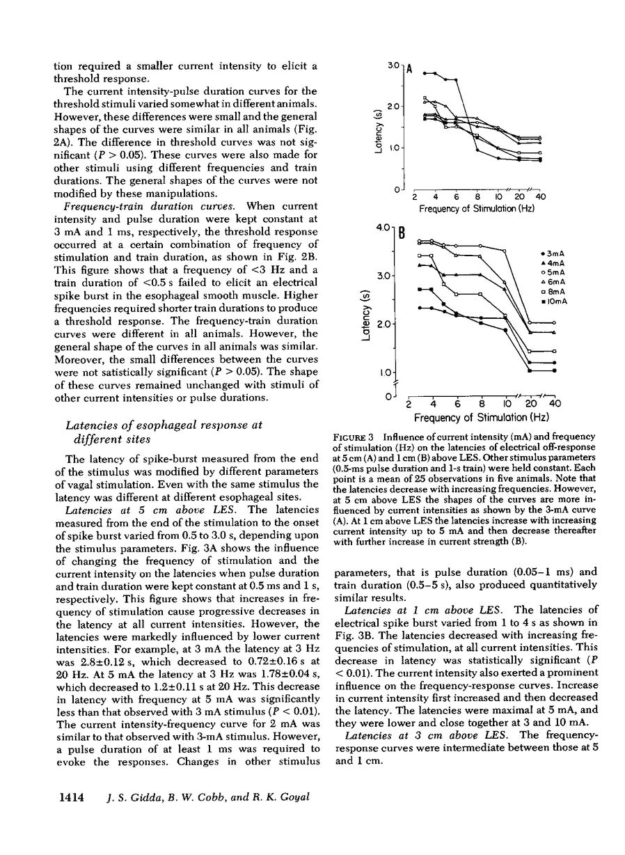 Experiments were performed on anesthetized opossums to study the influence of vagal efferent stimulation on peristalsis in the esophageal smooth muscle using various stimulus parameters. Current intensity, pulse duration, frequency, and train duration were varied systematically. Electrical and mechanical activities were recorded simultaneously at 5, 3, and 1 cm above the lower esophageal sphincter (LES). Vagal efferent stimulation produced a spike burst and contraction with a latency after the termination of the stimulus. This latency varied at different sites with the same stimulus parameters. For example, a stimulus of 5 mA, 0.5 ms, 10 Hz, and 1-s train produced latencies for the electrical response of 1.48 +/- 0.04, 2.2 +/- 0.12, and 3.5 +/- 0.09 s (+/- SEM) at 5, 3, and 1 cm above LES, respectively. The differences in latency were statistically significant (P less than 0.01). The latency of response at any one site also changed with different stimulus parameters; e.g. at 1 cm above LES, the latency of electrical response at 10 Hz was 3.5 +/- 0.09 s, but at 20 Hz the latency was 2.01 +/- 0.06 s when current intensity, pulse, and train duration remained at 5 mA, 0.5 ms, and 1 s. This decrease in latency with increasing frequency was statistically significant (P less than 0.01). By changing stimulus parameters, antiperistalsis or peristalsis with different speeds of propagation could be induced. Antiperistalsis or simultaneous responses occurred near threshold stimulus parameters. Suprathreshold stimuli produced peristaltic responses. Speed of peristalsis in the distal esophagus was 1.82 +/- 0.08 cm/s with swallowing, which was not different from 1.98 +/- 0.14 cm/s (P greater than 0.05) with vagal stimulation of 5 mA, 0.5 ms, 10 Hz, and 1-s train. These studies suggest that: (a) peristalsis in the smooth muscle part of the esophagus can be explained entirely on the basis of peripheral mechanisms, and (b) the central nervous system may modulate the occurrence, polarity, and speed of propagation by modifying the intensity and frequency of vagal activation.