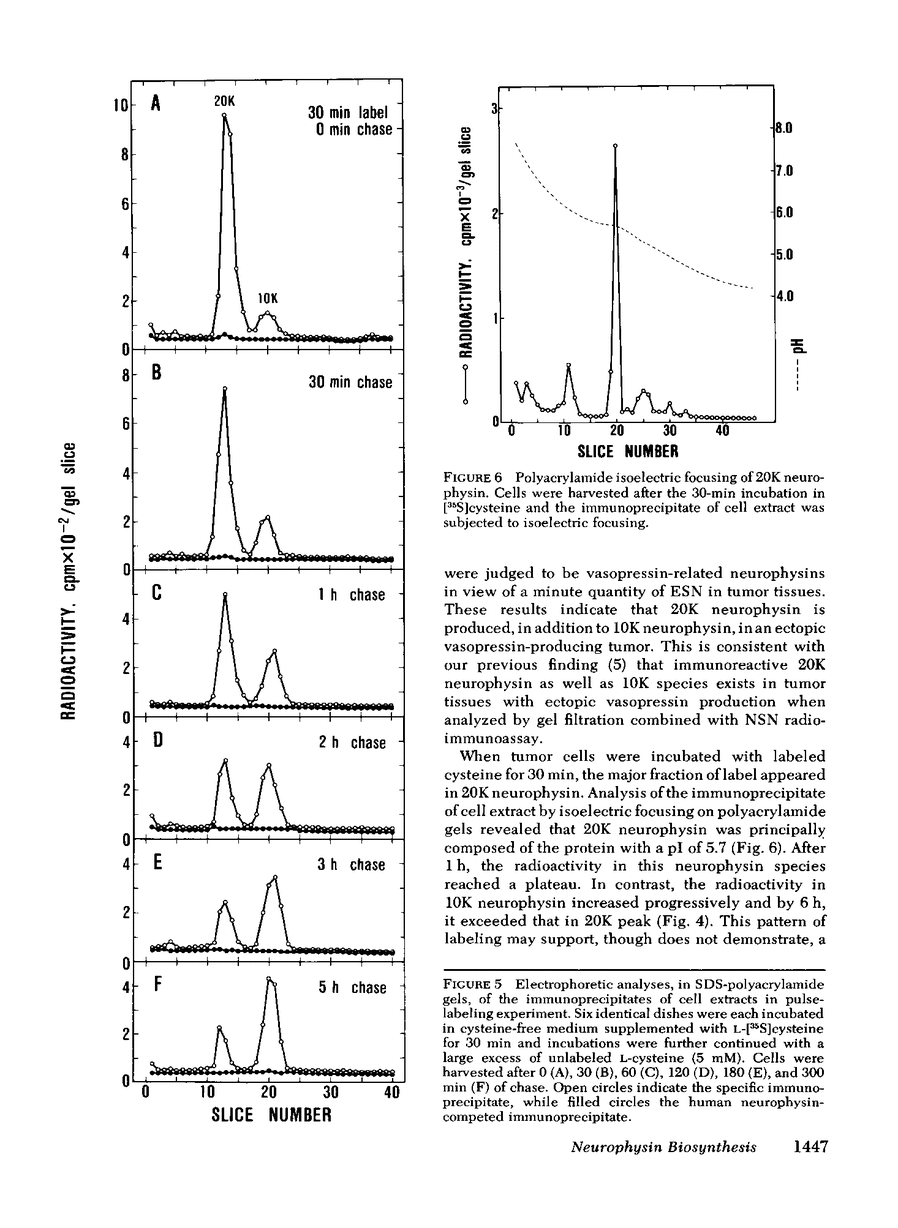 The incorporation of labeled compounds into neurophysins of a transplantable human oat cell carcinoma of the lung with ectopic vasopressin production was studied in vitro. Neurophysins in cell extracts and in incubation media were isolated by immunoprecipitation and analyzed by sodium dodecyl sulfate (SDS)-polyacrylamide gel electrophoresis. When cells were incubated with L-[35S]cysteine for 12 h, SDS-polyacrylamide gel electrophoresis of the immunoprecipitates from cell extract and medium resolved two forms of neurophysins with apparent molecular mass of 10,000 (10K) and 20,000 (20K). Both forms of [35S]-neurophysins were completely displaced from the immunoprecipitates by excess human neurophysin. Incubation of cells with L-[35S]cysteine and D-[3H]-glucosamine hydrochloride revealed that glucosamine was incorporated into the 20K neurophysin region, but not into 10K species. To observe the kinetics of labeling of the two forms of neurophysins, cells were incubated with L[35S]cysteine for varying periods of time. After short labeling periods, most of the radioactivity resided in 20K species, which plateaued after 1 h, whereas 10K neurophysin progressively increased in its height. When cells were chased with unlabeled cysteine after the exposure to a short pulse of labeling, 20K neurophysin peak gradually decreased with an apparent initial half-life of 1 h. In contrast, the label in 10K neurophysin steadily increased, which exceeded the former by 3 h of chase. Analysis of 20K neurophysin in cell extract by isoelectric focusing on polyacrylamide gel demonstrated that it was principally composed of a protein with an apparent isoelectric point (pI) of 5.7. These results suggest that neurophysin is synthesized in ectopic vasopressin-producing tumors by post-translational processing from a glycosylated proneurophysin with an apparent molecular mass of 20,000 daltons and a pI of 5.7.