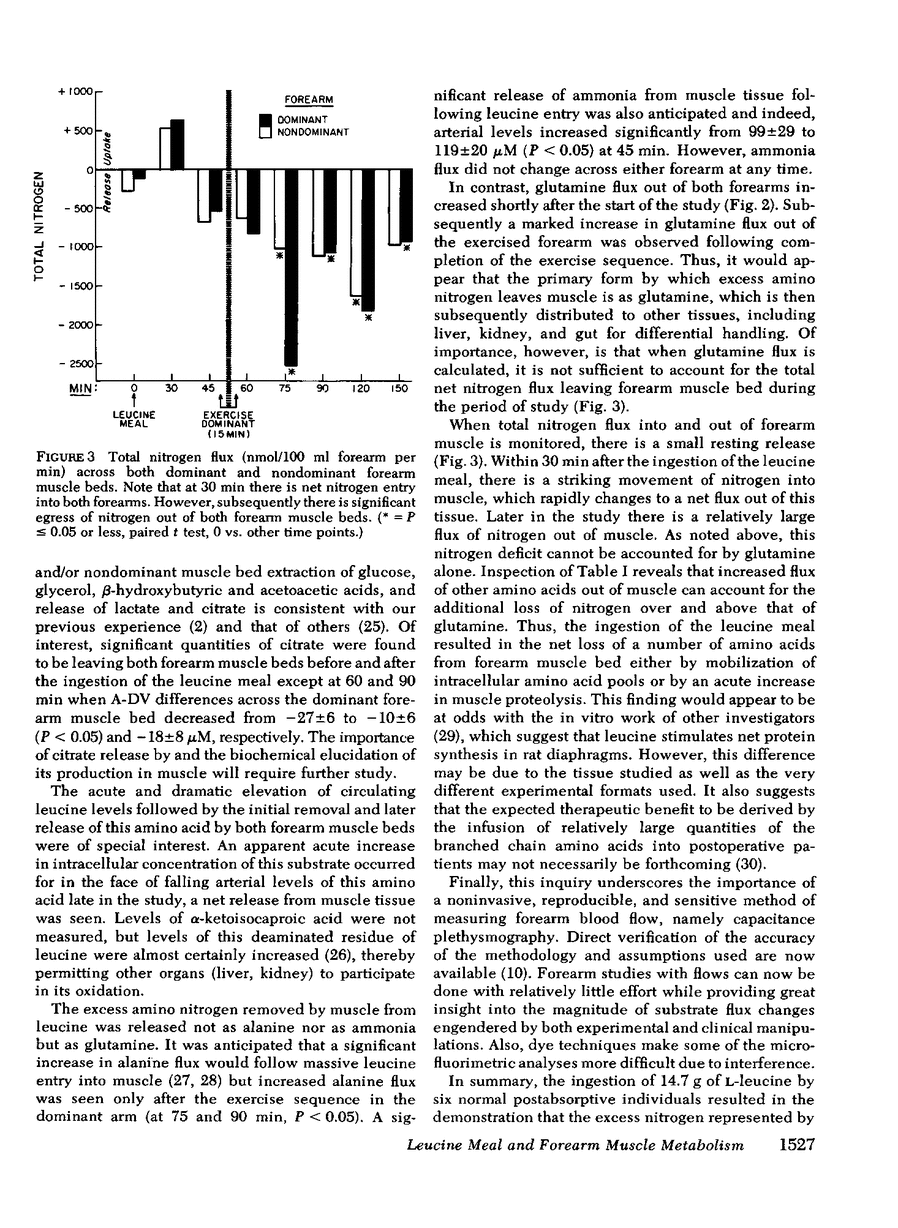 To assess the consequences of elevated branched chain amino acid levels on alanine, glutamine, and ammonia metabolism in muscle, L-leucine meals (14.7 g) were consumed by six normal postabsorptive individuals. Bilateral forearm studies were performed, and the dominant arm was subjected to 15 min of light exercise, using a calibrated dynamometer, beginning 45 min after the ingestion of the meal. Large uptakes of leucine were seen across both forearm muscle beds within 30 min of the meal. After exercise, blood flow in the dominant arm increased from 3.1 +/- 0.4 to 5.2 +/- 0.9 ml/100 ml forearm per minute (mean +/- SEM, P less than 0.005). Glutamine flux out of the dominant forearm increased threefold after the ingestion of the leucine meal and increased eightfold over base line after exercise. Less marked changes (significant only at 90 min) in the nonexercised, nondominant arm were also seen. Alanine flux out of the dominant forearm muscle bed increased modestly at 75 and 90 min. No significant change in ammonia flux across either forearm muscle bed was noted. Unexpectedly, large and significant net nitrogen loss from both forearm muscle beds was documented. Thus, following the ingestion of a leucine meal and light exercise, the primary means by which excess nitrogen is routed out of muscle is via glutamine formation and release with alanine and ammonia pathways playing relatively minor roles. More importantly, the ingestion of significant amounts of leucine by normal subjects, presumably in optimal nitrogen balance, results in a net loss of nitrogen from muscle.