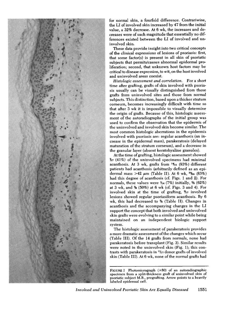 A highly significant, but unanswered, question in the pathogenesis of psoriasis relates to how normal appearing and diseased skin can coexist, undergo spontaneous flares and remissions, and yet appear to be genetically acquired. A plausible explanation for these disparate observations is that there is a basic defect in epidermal proliferation of skin of subjects with psoriasis and that disease expression is governed by other host factors. To address this question, we compared epidermal proliferation of skin involved and uninvolved with psoriasis with normal skin before and after transplantation to congenitally athymic (nude) mice, a biologic milieu free of humoral factors unique to the donor host. Results demonstrated that (a) before transplant, synthesis of DNA by the epidermal cells from skin uninvolved and involved with psoriasis is significantly higher than normal, 1.6 and 3.6 times, respectively; (b) 6 wk after transplantation, synthesis of DNA by epidermal cells is unchanged for normal skin, increased for uninvolved skin, and decreased for involved skin. These increases and decreases are of such a magnitude that at 6 wk the number of epidermal cells synthesizing DNA per 1,000 basal cells is identical, and is 2.2 times that of normal skin. When removed from the milieu of the afflicted host, skin involved and uninvolved with psoriasis appear equally "diseased." These data support the notion that there is aberrant epidermal proliferation in skin of patients with psoriasis and that host factors appear to play a role both in the expression and nonexpression of this disease.