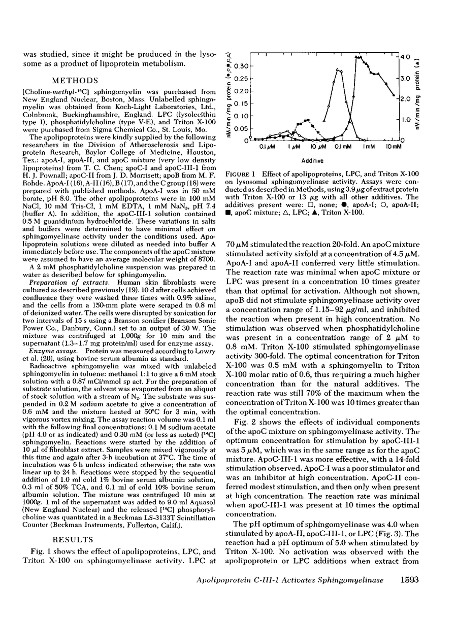 Apolipoprotein (apo)C-III-1 from human very low density lipoprotein stimulates 14-fold the activity of lysosomal sphingomyelinase from human fibroblasts. At the sphingomyelin concentrations tested, maximal stimulation was obtained with 5 microM apoC-III-1 or apoC mixture. Apolipoproteins A-I, A-II, B, and C-I conferred little or no stimulation. Sphingomyelinase was stimulated 20-fold by lysophosphatidylcholine with an optimum concentration of 70 microM using 0.3 mM substrate. Sphingomyelinase activity was inhibited by concentrations of apoC-III-1 and lysophosphatidylcholine three- to fivefold above stimulatory levels. Triton X-100 activated sphingomyelinase 300-fold with a pH optimum of 5.0, while the pH optimum with the biological activators was 4.0. These results raise the possibility of an in vivo activity for the biological activators. The proteins that enter lysosomes as part of a lipoprotein complex may activate lysosomal enzymes that degrade the lipid components.
