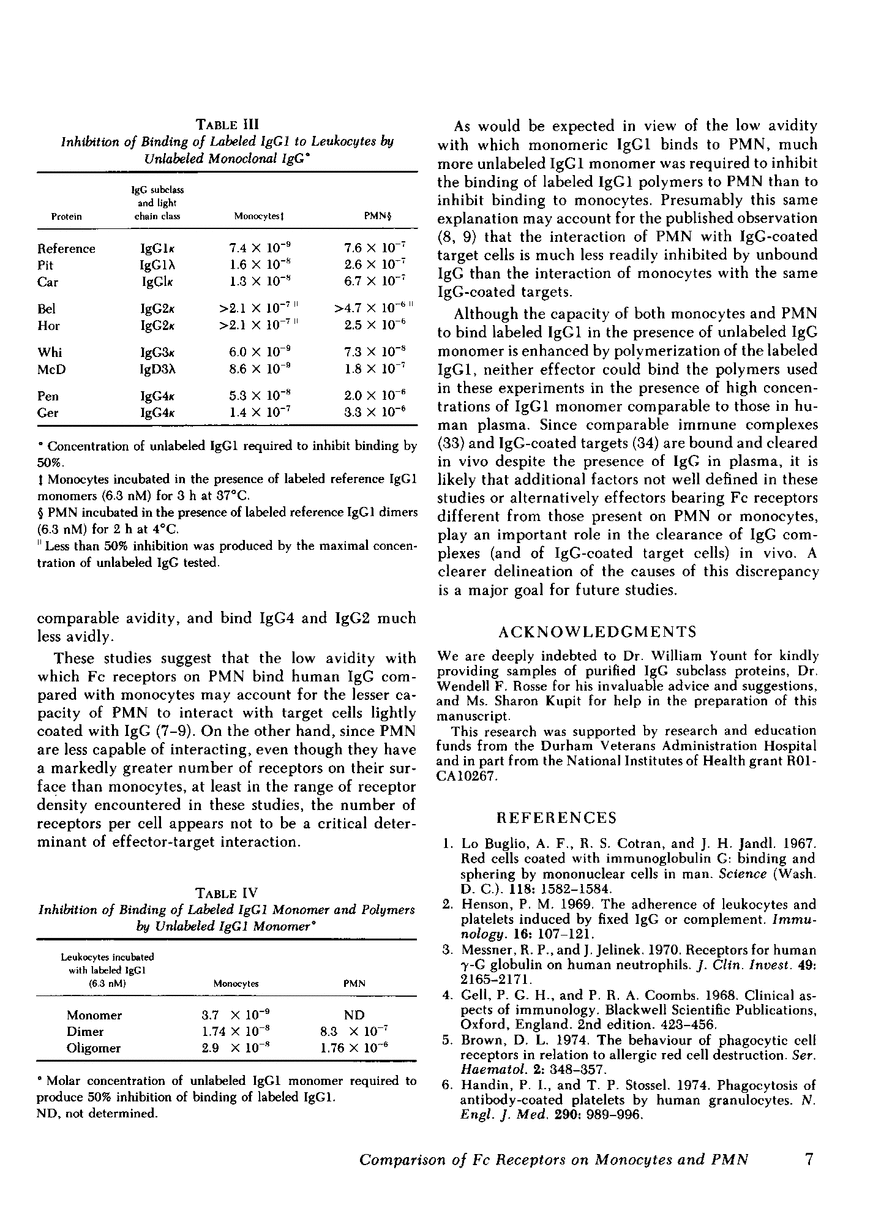 Covalently cross-linked dimers and oligomers composed of 2-4 subunits of monoclonal human IgG1 were prepared by incubation of purified monomeric IgG1 with glutaraldehyde followed by gelfiltration chromatography. Monomers, dimers, and oligomers then were labeled with 125I and used to compare the binding properties of IgG Fc receptors on human peripheral blood monocytes and polymorphonuclear leukocytes (PMN). Binding of IgG1 to monocytes at 37°C and of IgG1 polymers to PMN at 4°C could be readily measured and were found to be reversible and saturable. Scatchard plots of binding were linear in each instance. Monocytes bound a mean of 20,200±6,800 molecules/cell of IgG1 monomer at saturation and comparable amounts of dimer or oligomer. The mean association constant (Ka) for binding of IgG1 monomer to monocytes was 8.6 × 108M−1 and the Ka for binding of dimer and oligomer were three-to fivefold greater.