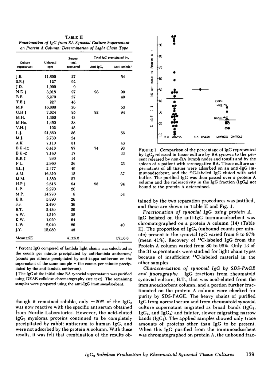 The cellular infiltrate in the deeper layers of the rheumatoid synovium produces a substantial amount of immunoglobulin (Ig)G. Culture supernatants of synovial tissues from 31 patients with rheumatoid arthritis (RA) undergoing joint replacement or synovectomy have been analyzed for the subclass of IgG present. IgG3 was measured by separation with Staphylococcal Protein A chromatography, precipitation with specific anti-IgG3 antibody, and differential separation of IgG3 heavy chains using polyacrylamide gel electrophoresis. IgG from RA synovial cultures contained an average of 41% IgG3 (range, 8-97%) compared with 12% IgG3 (range, 6-17%) in the serum IgG of the same patients. A group of non-RA control lymphoid tissues (four lymph nodes and five tonsils) produced 23% of total IgG as the IgG3 subclass (range, 16-35%). An average of only 9% of the synovial IgG showed aggregation compatible with IgG-rheumatoid factor (IgG-RF). Purified IgG from some of the RA synovial culture supernatants also showed significant restriction when separated by isoelectric focusing. This restriction and the enrichment for the IgG3 subclass in the IgG from RA synovial cultures suggest that either an antigen in the inflamed joint is selectively stimulating an antibody in this subclass, or that significantly differences in the catabolic rate of this subclass are found in cultures of synovial tissue when compared with that occurring in intact patients.