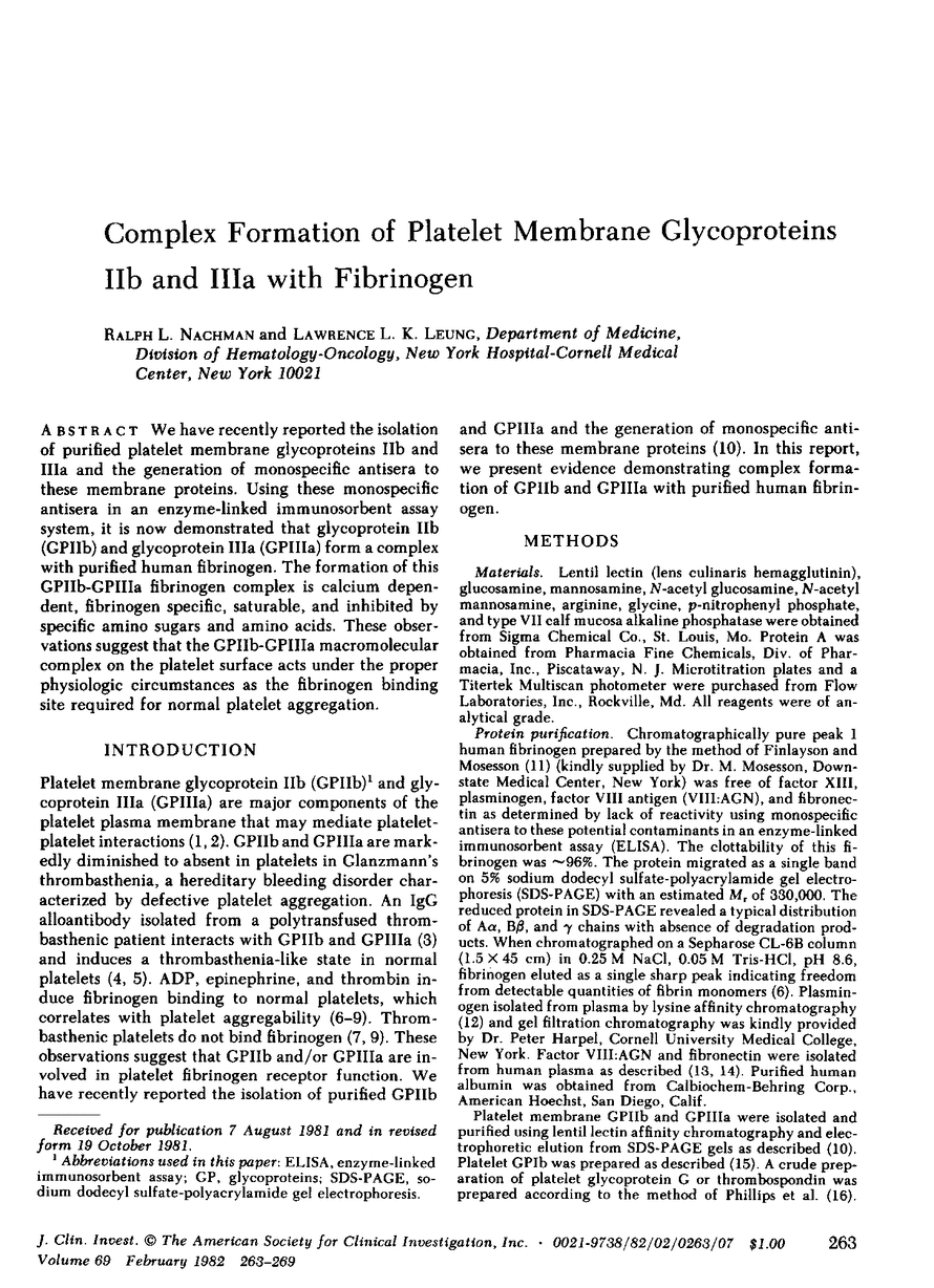 We have recently reported the isolation of purified platelet membrane glycoproteins IIb and IIIa and the generation of monospecific antisera to these membrane proteins. Using these monospecific antisera in an enzyme-linked immunosorbent assay system, it is no demonstrated that glycoprotein IIb (GPIIb) and glycoprotein IIIa (GPIIIa) form a complex with purified human fibrinogen. The formation of this GPIIb-GPIIIa fibrinogen complex is calcium dependent, fibrinogen specific, saturable, and inhibited by specific amino sugars and amino acids. These observations suggest that the GPIIb-GPIIIa macromolecular complex on the platelet surface acts under the proper physiologic circumstances as the fibrinogen binding site required for normal platelet aggregation.