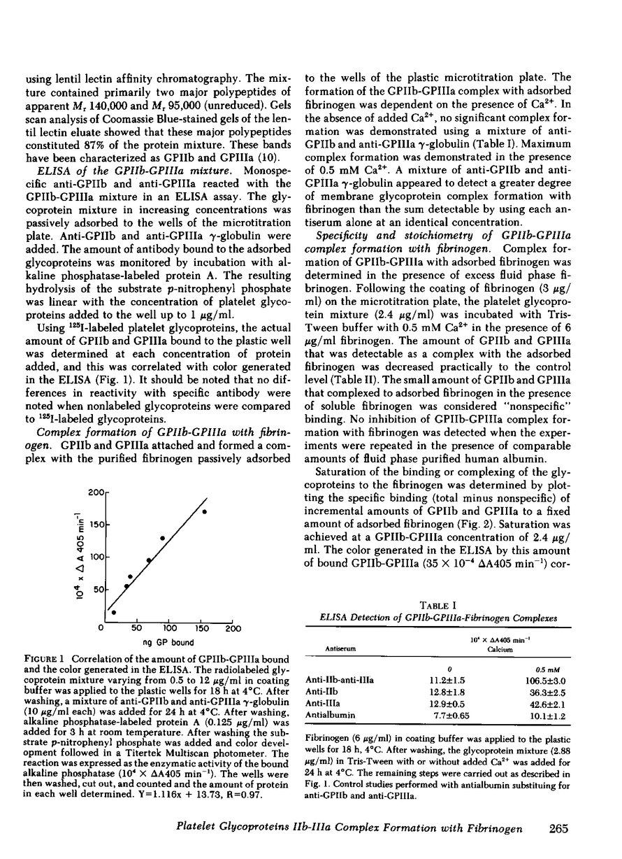 We have recently reported the isolation of purified platelet membrane glycoproteins IIb and IIIa and the generation of monospecific antisera to these membrane proteins. Using these monospecific antisera in an enzyme-linked immunosorbent assay system, it is no demonstrated that glycoprotein IIb (GPIIb) and glycoprotein IIIa (GPIIIa) form a complex with purified human fibrinogen. The formation of this GPIIb-GPIIIa fibrinogen complex is calcium dependent, fibrinogen specific, saturable, and inhibited by specific amino sugars and amino acids. These observations suggest that the GPIIb-GPIIIa macromolecular complex on the platelet surface acts under the proper physiologic circumstances as the fibrinogen binding site required for normal platelet aggregation.