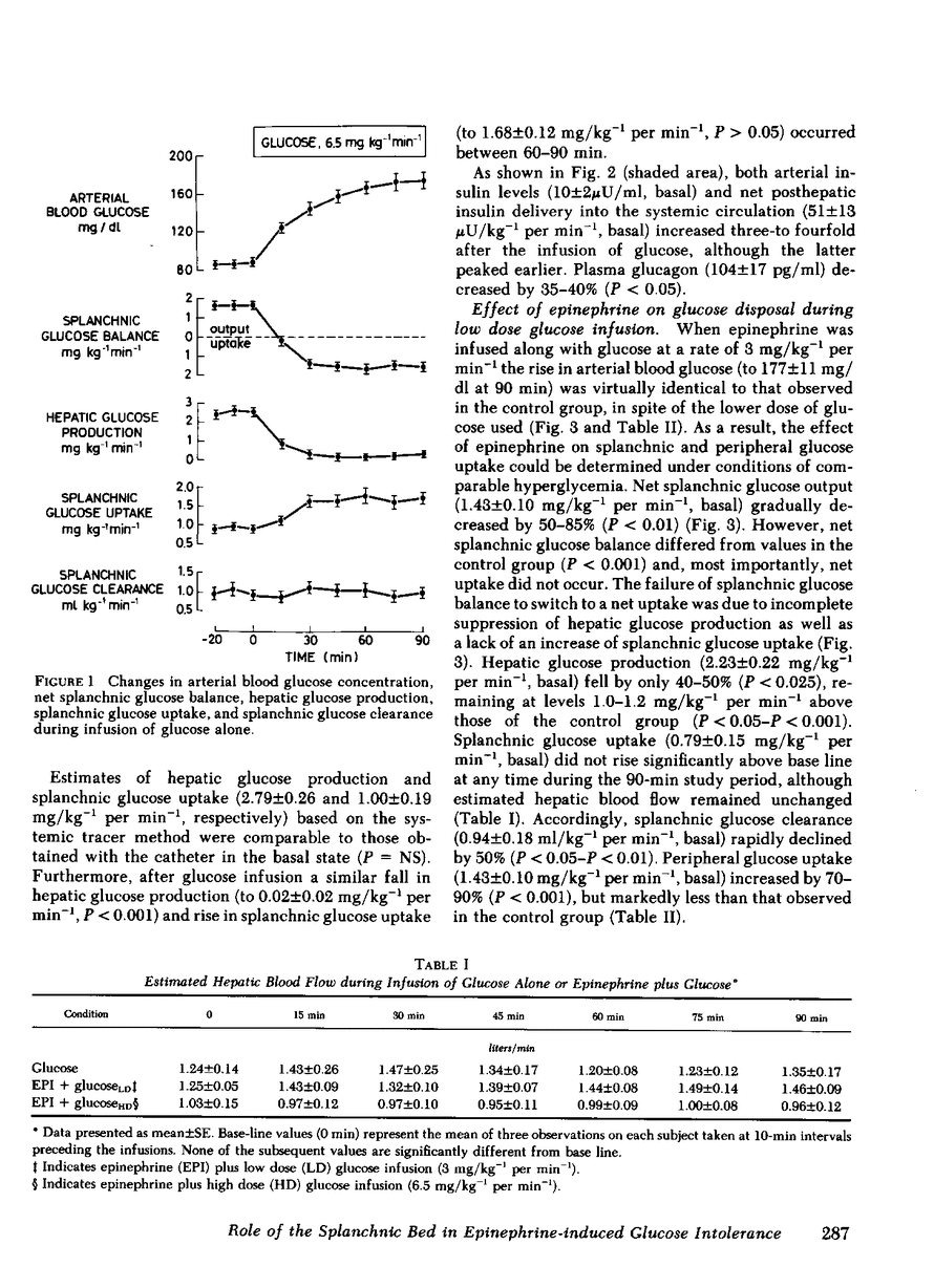 To evaluate the role of the splanchnic bed in epinephrine-induced glucose intolerance, we selectively assessed the components of net splanchnic glucose balance, i.e., splanchnic glucose uptake and hepatic glucose production, and peripheral glucose uptake by combining infusion of [3-3H]glucose with hepatic vein catheterization. Normal humans received a 90-min infusion of either glucose alone (6.5 mg/kg−1 per min−1) or epinephrine plus glucose at two dose levels: (a) in amounts that simulated the hyperglycemia seen with glucose alone (3.0 mg/kg−1 per min−1); and (b) in amounts identical to the control study. During infusion of glucose alone, blood glucose rose twofold, insulin levels and net posthepatic insulin release increased three- to fourfold, and net splanchnic glucose output switched from a net output (1.65±0.12 mg/kg−1 per min−1) to a net uptake (1.56±0.18). This was due to a 90-95% fall (P < 0.001) in hepatic glucose production and a 100% rise (P < 0.001) in splanchnic glucose uptake (from 0.86±0.14 to 1.71±0.12 mg/kg−1 per min−1), which in the basal state amounted to 30-35% of total glucose uptake. Peripheral glucose uptake rose by 170-185% (P < 0.001). When epinephrine was combined with the lower glucose dose, blood glucose, insulin release, and hepatic blood flow were no different from values observed with glucose alone. However, hepatic glucose production fell only 40-45% (P < 0.05 vs. glucose alone) and, most importantly, the rise in splanchnic glucose uptake was totally blocked. As a result, splanchnic glucose clearance fell by 50% (P < 0.05), and net splanchnic glucose uptake did not occur. The rise in peripheral glucose uptake was also reduced by 50-60% (P < 0.001). When epinephrine was added to the same dose of glucose used in the control study, blood glucose rose twofold higher (P < 0.001). The initial rise in splanchnic glucose uptake was totally prevented; however, beyond 30 min, splanchnic glucose uptake increased, reaching levels seen in the control study when severe hyperglycemia occurred. Splanchnic glucose clearance, nevertheless, remained suppressed throughout the entire study (40%-50%, P < 0.01).