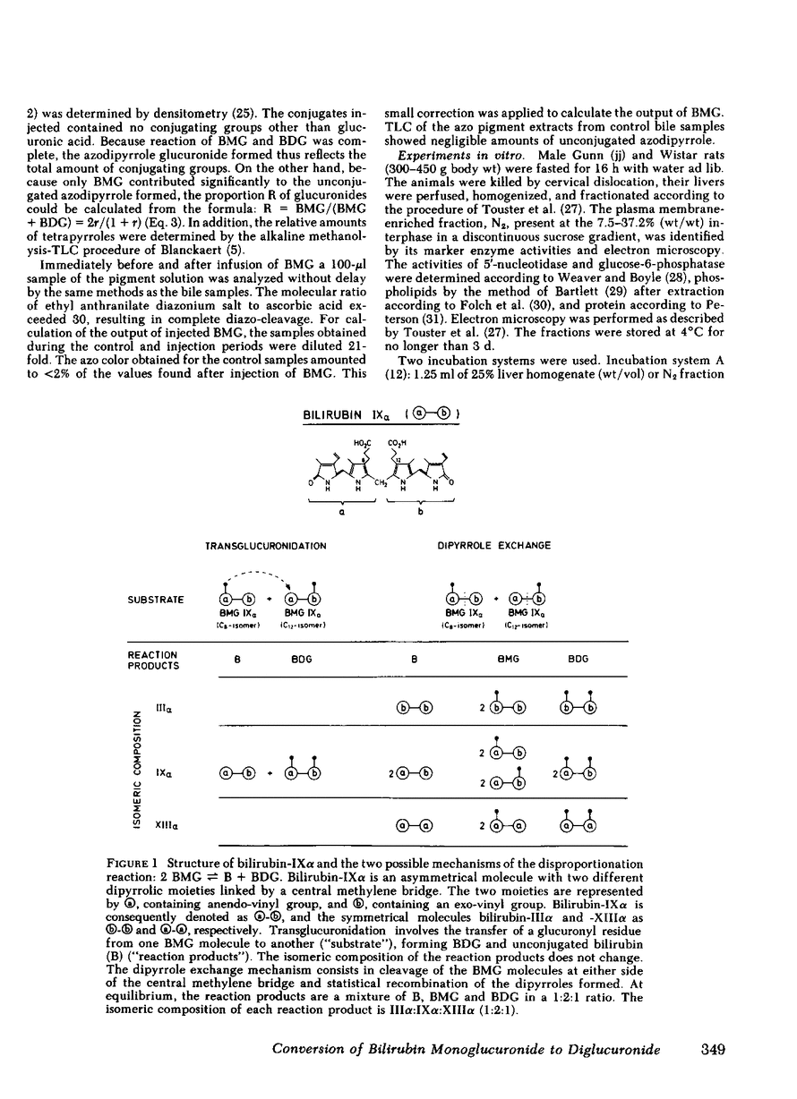 Two routes have been proposed for conversion of bilirubin monoglucuronide to the diglucuronide: glucuronyl transfer (a) from UDP-glucuronic acid to bilirubin monoglucuronide, catalyzed by a microsomal UDP-glucuronyltransferase, and (b) from one molecule of bilirubin monoglucuronide to another (transglucuronidation), catalyzed by an enzyme present in liver plasma membranes. The evidence regarding the role of the latter enzyme for in vivo formation of bilirubin diglucuronide is conflicting. We therefore decided to reexamine the transglucuronidation reaction in plasma membranes and to study the conversion of bilirubin monoglucuronide to diglucuronide in vivo. Purified bilirubin monoglucuronide was incubated with homogenates and plasma membrane-enriched fractions from liver of Wistar and Gunn rats. Stoichiometric formation of bilirubin and bilirubin diglucuronide out of 2 mol of bilirubin monoglucuronide was paralleled by an increase of the IIIα- and XIIIα-isomers of the bilirubin aglycone, thus showing that dipyrrole exchange, not transglucuronidation, is the underlying mechanism. Complete inhibition by ascorbic acid probably reflects intermediate formation of free radicals of dipyrrolic moieties. The reaction was nonenzymic because it proceeded independently of the protein concentration and heat denaturation of the plasma membranes did not result in decreased conversion rates. Collectively, these findings show spontaneous, nonenzymic dipyrrole exchange when bilirubin monoglucuronide is incubated in the presence of rat liver plasma membranes. Because bilirubin glucuronides present in biological fluids contain exclusively the bilirubin-IXα aglycone, formation of the diglucuronide from the monoglucuronide by dipyrrole exchange does not occur in vivo. Rapid excretion of unchanged bilirubin monoglucuronide in Gunn rat bile after injection of the pigment provides confirmatory evidence for the absence of a UDP-glucuronic acid-independent process.
