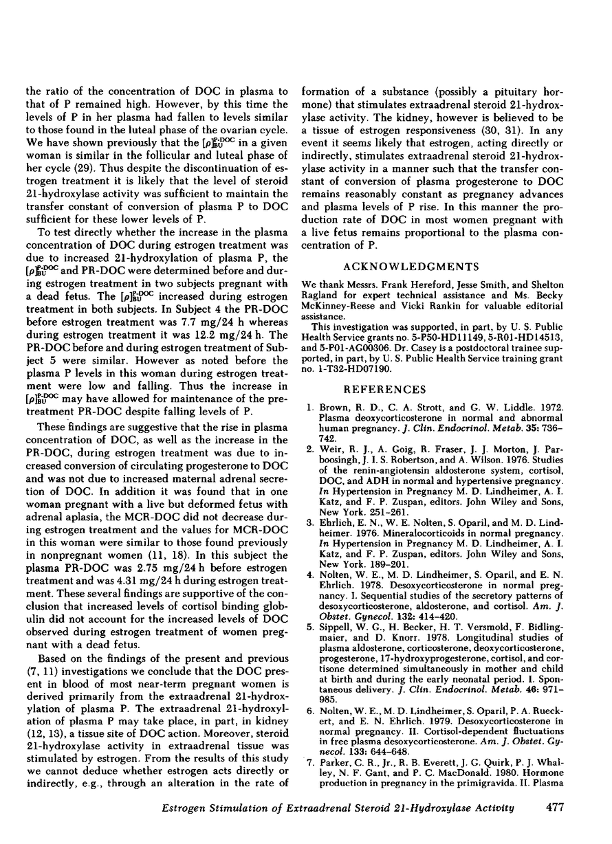 We measured deoxycorticosterone (DOC) and progesterone (P) in plasma of 47 women pregnant with a dead fetus and sequentially throughout gestation in 35 women pregnant with a live fetus. When P levels in plasma were low, the plasma levels of DOC in women pregnant with a dead fetus varied but usually were similar to those in women pregnant with a live fetus. However, when P levels were high, the levels of DOC in some women pregnant with a dead fetus were considerably lower than those in women pregnant with a live fetus. To test whether this finding was due to loss of transfer of DOC from fetus to mother or else loss of extraadrenal steroid 21-hydroxylase activity in the mother after death of the fetus, we conducted several studies. The levels of P and DOC in plasma of one woman remained constant from 30 min after fetal death until delivery occurred 13 h later. Estrogen treatment of four women pregnant with a dead fetus brought about an increase in plasma levels of DOC in three of the women. In one woman the ratio of plasma DOC to P was 0.015, a value similar to that found before fetal death, but was 0.003 after fetal death but before estrogen treatment. In two women pregnant with a dead fetus the transfer constants of conversion of plasma P to DOC were 0.011 and 0.005 before, and 0.024 and 0.013, respectively, during estrogen treatment. In one woman pregnant with a deformed fetus with adrenal agenesis, the metabolic clearance rates of DOC before and during estrogen treatment were similar, whereas the plasma production rates of DOC were 2.75 before and 4.31 mg/24 h during estrogen treatment. We suggest that (a) the DOC in plasma of near-term pregnant women arises in part by extraadrenal 21-hydroxylation of plasma P and (b) estrogen stimulates steroid 21-hydroxylase activity in extraadrenal tissues.