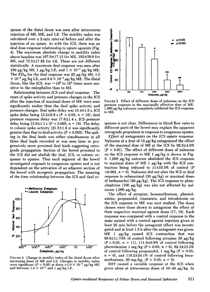 Although opioid peptides have been demonstrated immunohistochemically in the feline intestine, the action of these peptides is unknown. The aims of this study were: (a) to determine the distal ileal and ileocecal sphincter (ICS) responses to morphine sulfate (MS), methionine enkephalin (ME) and leucine enkephalin (LE); (b) to determine the mechanism by which exogenous opiates mediate these responses; (c) to determine the type of receptor involved in mediating these responses and (d) to ascertain whether endogenous opiate-mediated responses may be vagally induced. The ICS responded to all three opiate agonists with tonic and phasic contractions, the latter being associated with increased spike activity. The EDmax for ICS pressure response was 1 μg/kg for ME, 5 μg/kg for LE, and 150 μg/kg for MS. The distal ileum responded with increased spike activity and phasic contractions. The EDmax for the ileal motility index response was 1.0 × 10−1 μg/kg for ME, 1 μg/kg for LE, and 150 μg/kg for MS. Thus, both sites demonstrated similar dose-response relationships, both responding to at least 100 times lower doses of enkephalins than MS. The ICS contraction preceded ileal contractions. The ileal and ICS response was not antagonized by atropine, hexamethonium, phentolamine, propranolol, cinanserin, or tetrodotoxin. Naloxone, 600 μg/kg, antagonized the response to the enkephalins while 10 μg/kg antagonized the response to MS. Higher doses of the specific-receptor agonist SKF 10047 and κ-receptor agonist ketocyclazocine were required before a contractile response was elicited. Electrical stimulation of the cervical vagus induced ICS contraction and a fall in blood pressure. The ICS contractile response but not the blood pressure response was inhibited by naloxone 1 mg/kg. These data indicate: (a) tonic and phasic ICS contraction followed by ileal contraction may be mediated through δ-type opiate receptors located in the muscle membrane and (b) opiate-mediated ICS contraction may be induced during vagal stimulation.