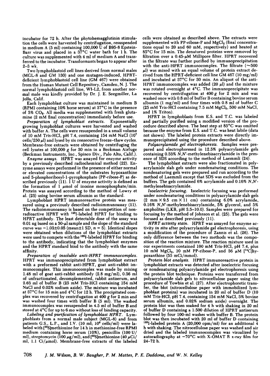 We have explored the possibility of using cultured lymphoblasts from patients with a deficiency of hypoxanthine-guanine phosphoribosyltransferase (HPRT) as a source of cells for the isolation and characterization of mutant forms of the enzyme. HPRT from lymphoblasts derived from six male patients of five unrelated HPRT-deficient families was highly purified and characterized with regard to: (a) level of immunoreactive protein, (b) absolute specific activity, (c) isoelectric point, (d) migration during nondenaturing polyacrylamide gel electrophoresis, and (e) apparent subunit molecular weight. There experiments were performed on small quantities of lymphoblasts using several micromethods involving protein blot analysis of crude extracts as well as isolation and characterization of enzyme labeled in culture with radioactive amino acids. The lymphoblast enzymes from four of the patients exhibited structural and functional abnormalities that were similar to the recently described abnormalities found with the highly purified erythrocyte enzymes from these same patients. In addition, a previously undescribed HPRT variant was isolated and characterized from lymphoblasts derived from two male siblings. This unique variant has been called HPRT Ann Arbor. We conclude that lymphoblastoid cell lines can be used as a source of cells for the detection, isolation, and characterization of structural variants of human HPRT.