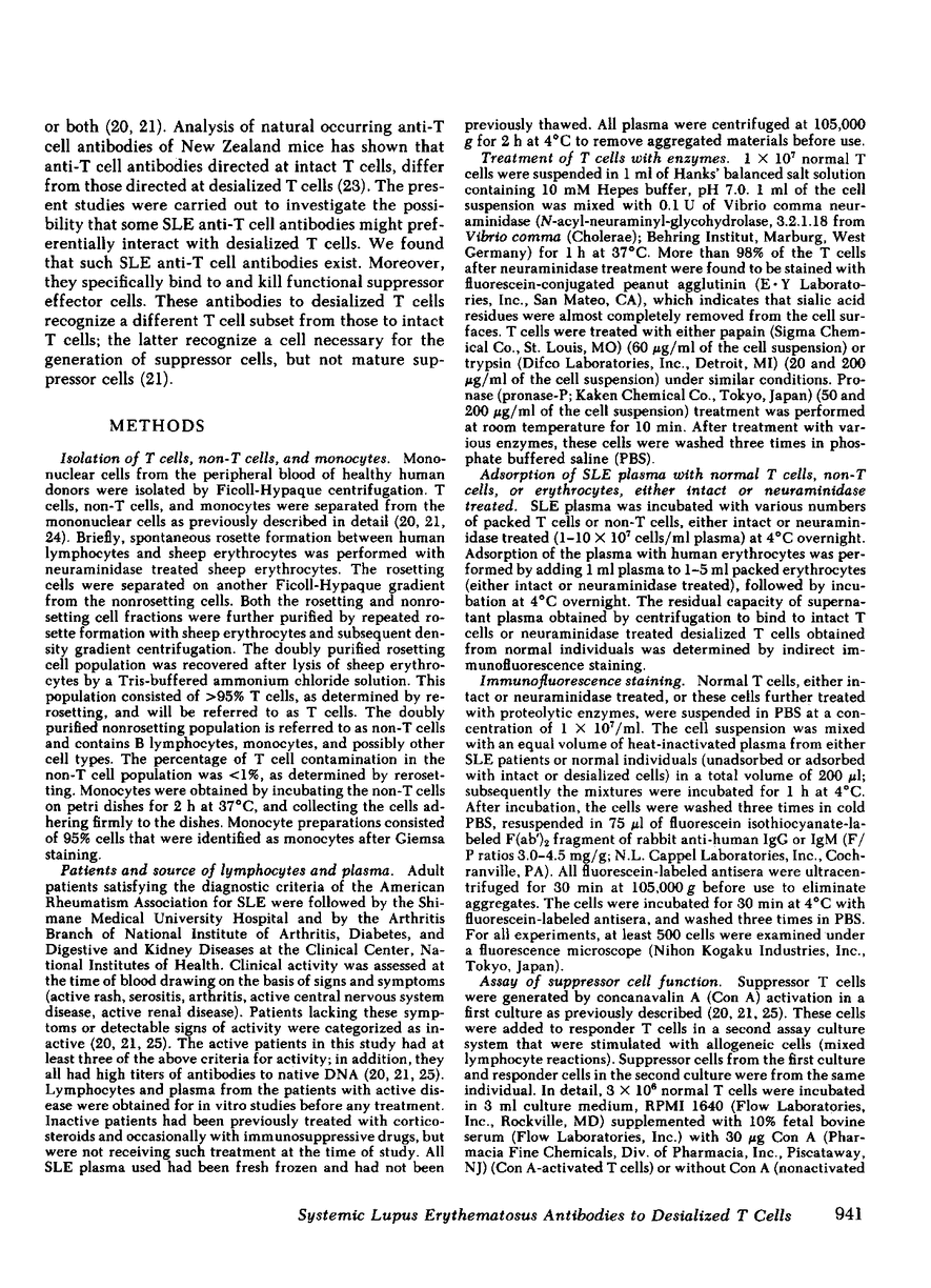 Patients with systemic lupus erythematosus (SLE) were found to have in their plasma antibodies specific for desialized T cells. Adsorption studies with intact or desialized T cells indicated that SLE anti-T cell antibodies consisted of two populations with different target cell specificities, one capable of recognizing unique determinants on desialized T cells and another able to bind to both intact and desialized T cells. Normal T cells did not remove the antibodies specific for desialized T cells. moreover, the antibodies to desialized T cells were not removed by adsorption with either desialized non-T cells or desialized erythrocytes. Thus, the antibodies to desialized T cells recognize a determinant that is unique to a T cell subset and also includes a sugar. Inhibition studies with various sugars indicated that lactose was the most potent inhibitor of antibody binding. The anti-desialized T cell antibody appears to recognize a T cell determinant which includes lactose, probably in the form of a beta-galactosyl residue, but which also includes additional T cell determinants. The antibodies to desialized T cells were found to bind preferentially to concanavalin A-induced autorosetting T cells, which had been already demonstrated to contain suppressor effector cells. Indeed, such antibodies were effective in eliminating suppressor effector function without interfering with T cells necessary for such activation (such as precursor or inducer cells). Finally, studies of patients with SLE yielded a highly significant correlation (r = 0.92) between impaired suppressor effector function of their cells and the presence of antibodies to desialized T cells in their plasma.