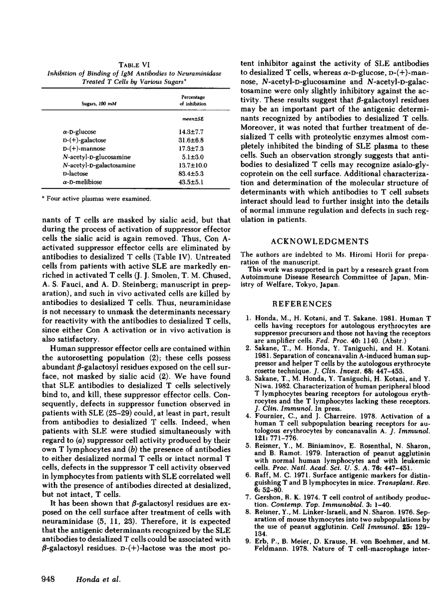 Patients with systemic lupus erythematosus (SLE) were found to have in their plasma antibodies specific for desialized T cells. Adsorption studies with intact or desialized T cells indicated that SLE anti-T cell antibodies consisted of two populations with different target cell specificities, one capable of recognizing unique determinants on desialized T cells and another able to bind to both intact and desialized T cells. Normal T cells did not remove the antibodies specific for desialized T cells. moreover, the antibodies to desialized T cells were not removed by adsorption with either desialized non-T cells or desialized erythrocytes. Thus, the antibodies to desialized T cells recognize a determinant that is unique to a T cell subset and also includes a sugar. Inhibition studies with various sugars indicated that lactose was the most potent inhibitor of antibody binding. The anti-desialized T cell antibody appears to recognize a T cell determinant which includes lactose, probably in the form of a beta-galactosyl residue, but which also includes additional T cell determinants. The antibodies to desialized T cells were found to bind preferentially to concanavalin A-induced autorosetting T cells, which had been already demonstrated to contain suppressor effector cells. Indeed, such antibodies were effective in eliminating suppressor effector function without interfering with T cells necessary for such activation (such as precursor or inducer cells). Finally, studies of patients with SLE yielded a highly significant correlation (r = 0.92) between impaired suppressor effector function of their cells and the presence of antibodies to desialized T cells in their plasma.