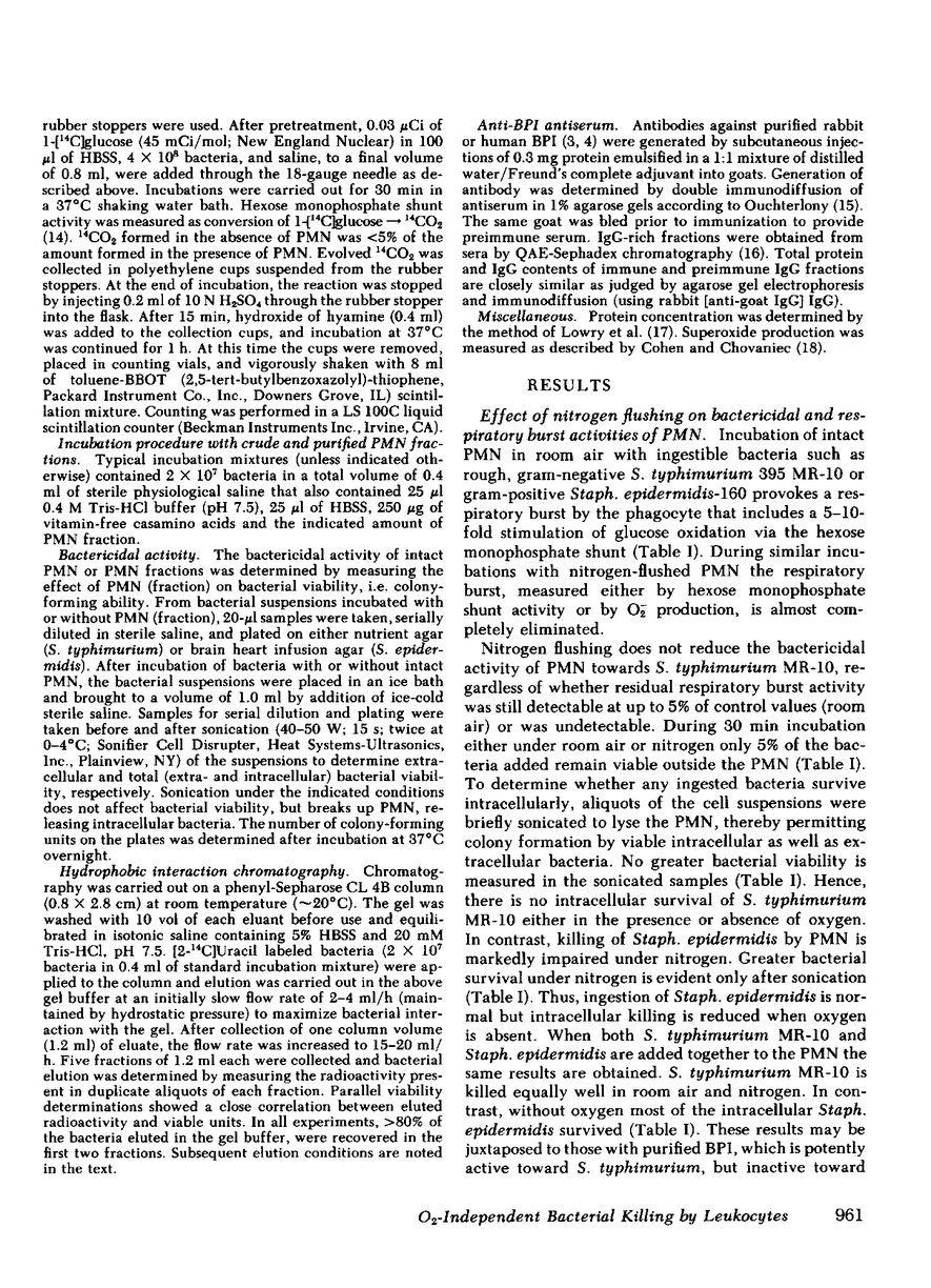 Previous studies have suggested that a cationic bactericidal/permeability-increasing protein (BPI) present in both rabbit and human polymorphonuclear leukocytes is the principal O2-independent bactericidal agent of these cells toward several strains of Escherichia coli and Salmonella typhimurium (1978. J. Biol. Chem. 253: 2664--2672; 1979. J. Biol. Chem. 254: 11000--11009). To further evaluate the possible role of this protein in the killing of gram-negative bacteria by polymorphonuclear leukocytes, we have measured the bactericidal activity of intact rabbit peritoneal exudate leukocytes under aerobic or anaerobic conditions and of intact human leukocytes from a patient with chronic granulomatous disease. Anaerobic conditions were created by flushing the cells under a nitrogen stream. Effective removal of oxygen was demonstrated by the inability of nitrogen-flushed leukocytes to mount a respiratory burst (measured as increased conversion of 1-[14C]glucose leads to 14CO2 or by superoxide production) during bacterial ingestion. At a bacteria/leukocyte ratio of 10:1, killing of gram-positive, BPI-resistant, Staphylococcus epidermidis is markedly impaired in the absence of oxygen (76.4 +/- 3.3% killing in room air, 29.2 +/- 8.2% killing in nitrogen). Essentially all increased bacterial survival is intracellular. In contrast, both a nonopsonized rough strain (MR-10) and an opsonized smooth strain (MS) of S. typhimurium 395 are killed equally well in room air and nitrogen. A maximum of 70--80 MR-10 and 30--40 MS are killed per leukocyte either in the presence or absence of oxygen. There is no intracellular bacterial survival in either condition indicating that intracellular O2-independent bactericidal system(s) of rabbit polymorphonuclear leukocytes can at least match the leukocyte's ingestive capacity. Whole homogenates and crude acid extracts manifest similar bactericidal capacity toward S. typhimurium 395. This activity can be accounted for by the BPI content of these cell fractions and is virtually eliminated by immune (anti-BPI), but not by preimmune goat IgG-rich fractions. Opsonization of smooth MS, required for bacterial killing by intact leukocytes, does not alter bacterial sensitivity to BPI in crude or purified form. Leukocytes of a patient with chronic granulomatous disease killed ingested S. typhimurium 396 MS nearly as well as did normal leukocytes. The bactericidal activity toward E. coli (J5) of crude acid extracts of the CGD and normal human leukocytes was virtually the same and was nearly completely inhibited by anti-BPI IgG-rich fractions, but not by preimmune IgG-rich fractions. These findings suggest that the killing of gram-negative bacteria such as S. typhimurium by intact polymorphonuclear leukocytes may also be attributed to the action of BPI.