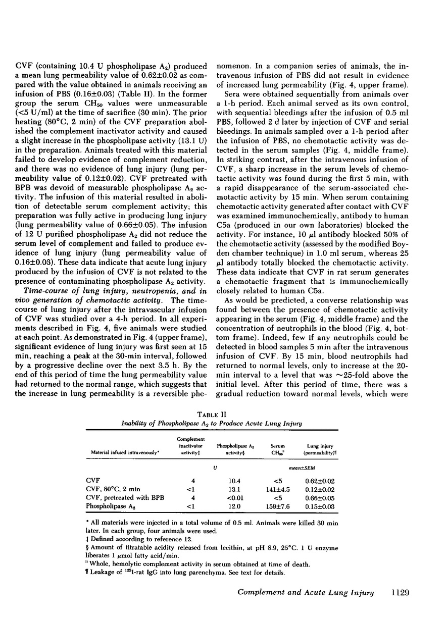 Intravascular activation of the complement system with cobra venom factor results in acute lung injury, which has been quantitated by increases in lung vascular permeability. Cobra venom factor preparations devoid of phospholipase A2 activity retain full lung-damaging capacity. The lung injury is associated with the preceding appearance of chemotactic activity in the serum coincident with the development of a profound neutropenia. The chemotactic activity is immunochemically related to human C5a. Morphologic studies have revealed discontinuities in the endothelial cell lining of lung alveolar capillaries, damage and/or destruction of endothelial cells in these areas, plugging of pulmonary capillaries with neutrophils that are in direct contact with vascular basement membrane, the presence of fibrin in alveolar spaces and in areas adjacent to damaged endothelial cells, and intraalveolar hemorrhage. Lung injury is dramatically attenuated in animals that have been previously neutrophil depleted. Teh intravenous injection of superoxide dismutase or catalase also provides significant protection from the pulmonary damage. Very little protection from the pulmonary damage. Very little protection is afforded by pretreatment of rats with antihistamine. These studies suggest that intravascular activation of the complement system leads to neutrophil aggregation and activation, intrapulmonary capillary sequestration of neutrophils, and vascular injury, which may be related to production of toxic oxygen metabolites by complement-activated neutrophils.