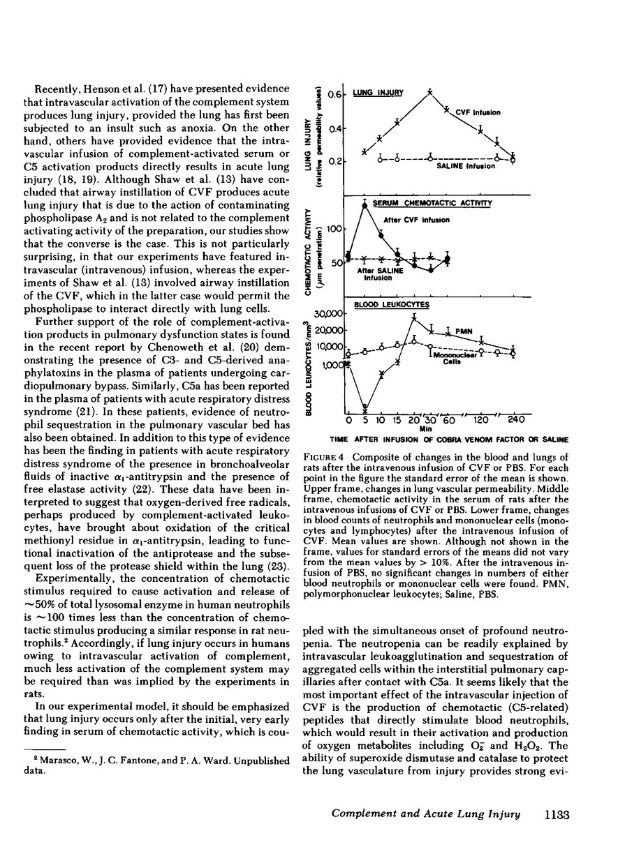 Intravascular activation of the complement system with cobra venom factor results in acute lung injury, which has been quantitated by increases in lung vascular permeability. Cobra venom factor preparations devoid of phospholipase A2 activity retain full lung-damaging capacity. The lung injury is associated with the preceding appearance of chemotactic activity in the serum coincident with the development of a profound neutropenia. The chemotactic activity is immunochemically related to human C5a. Morphologic studies have revealed discontinuities in the endothelial cell lining of lung alveolar capillaries, damage and/or destruction of endothelial cells in these areas, plugging of pulmonary capillaries with neutrophils that are in direct contact with vascular basement membrane, the presence of fibrin in alveolar spaces and in areas adjacent to damaged endothelial cells, and intraalveolar hemorrhage. Lung injury is dramatically attenuated in animals that have been previously neutrophil depleted. Teh intravenous injection of superoxide dismutase or catalase also provides significant protection from the pulmonary damage. Very little protection from the pulmonary damage. Very little protection is afforded by pretreatment of rats with antihistamine. These studies suggest that intravascular activation of the complement system leads to neutrophil aggregation and activation, intrapulmonary capillary sequestration of neutrophils, and vascular injury, which may be related to production of toxic oxygen metabolites by complement-activated neutrophils.