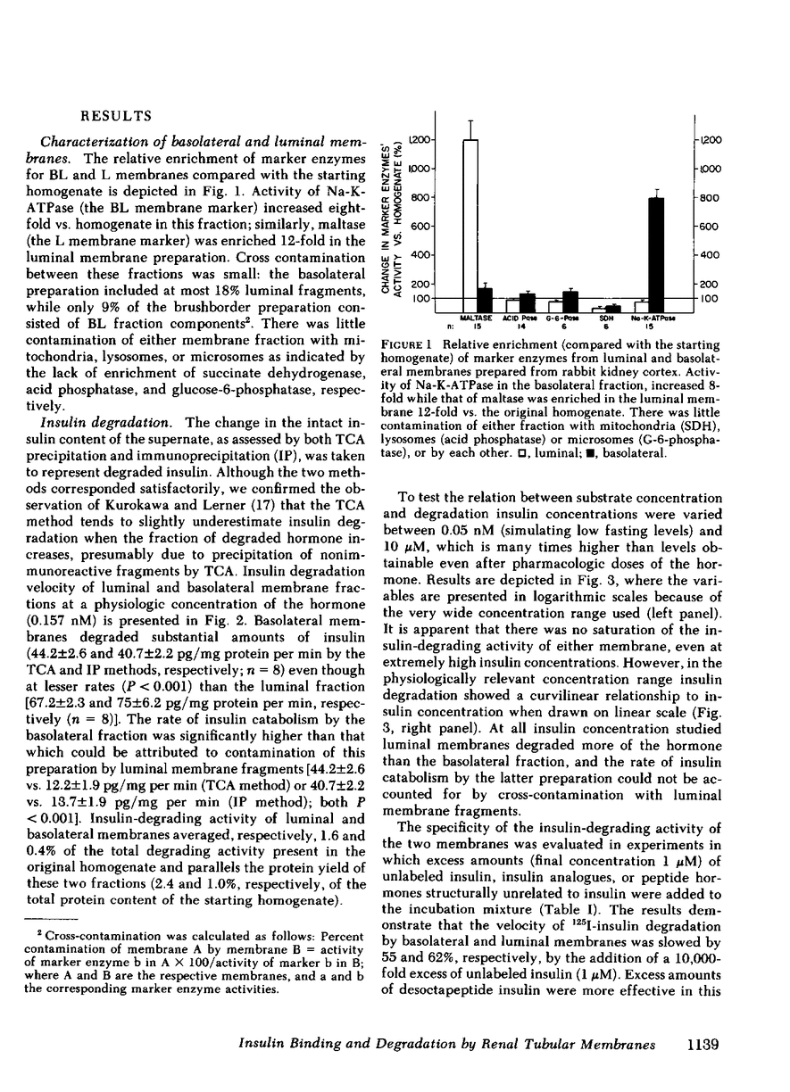 Insulin influences certain metabolic and transport renal functions and is avidly degraded by the kidney, but the relative contribution of the luminal and basolateral tubular membranes to these events remains controversial. We studied 125I-insulin degradation [TCA and immunoprecipitation (IP) methods] and the specific binding of the hormone by purified luminal (L) and basolateral (BL) tubular membranes. These were prepared from rabbit kidney cortical homogenates by differential and gradient centrifugation and ionic precipitation steps in sequence, which resulted in enrichment vs. homogenate of marker enzymes' activities (sodium-potassium-activated adenosine triphosphatase for BL and maltase for L) of 8- and 12-fold, respectively. Both fractions degraded insulin avidly and bound the hormone specifically without saturation even at pharmacologic concentrations (10 μM). At physiologic insulin concentrations (0.157 nM) BL membranes degraded substantial amounts of insulin (44.2±2.6 and 40.7±2.2 pg/mg protein per min by the TCA and IP methods, respectively), even though at lesser rates (P < 0.001) than the luminal fraction (67.2±2.3 and 75±6.2 pg/mg protein per min, respectively); the rate of insulin catabolism by BL membranes was significantly higher (P < 0.001) than that which could be attributed to their contamination by luminal components [12.2±1.9 pg/mg per min (TCA method), or 13.7±1.9 pg/mg per min (IP method)]. Competition experiments suggested that insulin-degrading activity in both fractions includes both specific and nonspecific components. In contrast to degradation, insulin binding by both membranes was highly specific for native insulin and was severalfold higher in BL than L membranes [17.5±1.3 vs. 4.5±0.4 fmol/mg protein (P < 0.001) at physiologic insulin concentrations]. Despite the marked difference in the binding capacity for insulin by the two membranes, the patterns of labeled insulin displacement by increasing amounts of unlabeled hormone were superimposable (50% displacement required ∼3 nM), suggesting that their receptors' affinity for insulin was similar. These observations provide direct evidence that interaction of insulin with the kidney involves binding and degradation of the hormone at the peritubular cell membrane.